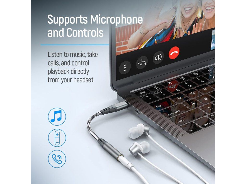Adaptér je vybaven integrovaným DAC čipem pro vysokou kvalitu zvuku s rozlišením 16bit, 48kHz a podporuje nejen přehrávání hudby, ale také telefonní hovory, funkci mikrofonu a ovládací tlačítka. Kompaktní provedení s délkou kabelu pouhých 14 cm zajišťuje snadné přenášení.