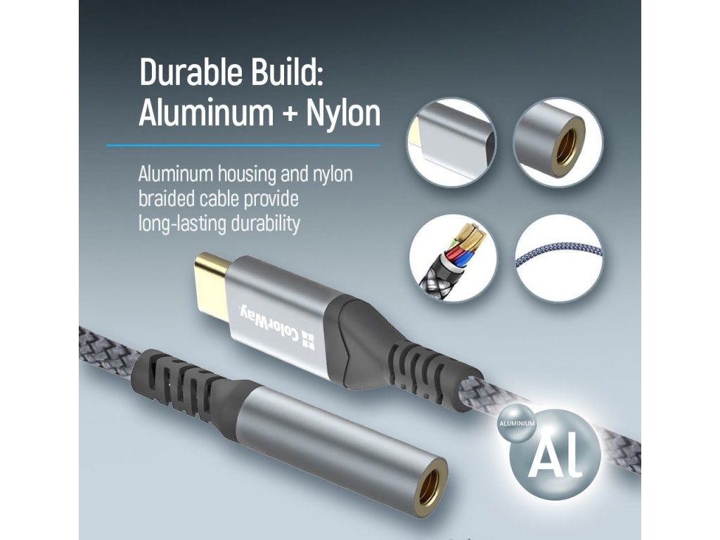 Pouzdro je vyrobeno z odolné hliníkové slitiny, která zajišťuje dlouhou životnost a elegantní vzhled. Kabel s nylonovým opletením odolává opotřebení a zamotání při každodenním používání.