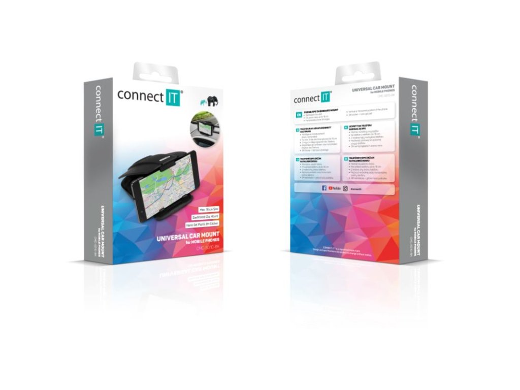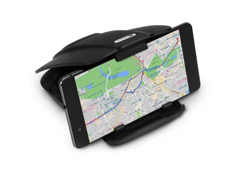 Univerzálny držiak do auta kompatibilný so zariadeniami až do šírky 16 cm (bez obmedzenia výšky zariadenia pri vodorovnej orientácii). Možnosť zvislej aj vodorovnej orientácie mobilného telefónu alebo navigácie