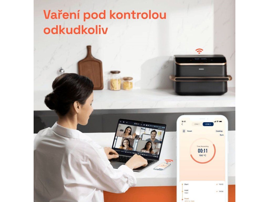 Inteligentná teplovzdušná fritéza Cosori TwinFry poskytuje maximálny priestor na varenie pre veľké rodiny alebo stretnutia a je doslova nabitá funkciami, ktoré umožňujú čo najrýchlejšie a najjednoduchšie varenie. V koši s objemom 10 litrov môžete pripravovať veľké kusy mäsa, celú hydinu, jahňacie mäso alebo mega porcie hranolčekov. Skutočným tromfom je možnosť rozdeliť kôš na dva 5-litrové koše, takže môžete pripravovať hlavné jedlo a prílohu oddelene. Vďaka funkcii Sync navyše fritéza zosúladí prípravu oboch, takže príprava sa dokončí v rovnakom čase a vy budete mať jedlo dokonalé, čerstvé a chutné. Fritéza obsahuje 4 výhrevné telesá s celkovým výkonom 2800 W. Vďaka hornému aj spodnému ohrevu nie je potrebné jedlo počas prípravy pretrepávať a nie je potrebné fritézu predhrievať. Maximálna teplota bola zvýšená na 240 °C, takže fritéza zvládne aj grilovanie. Jedlo môžete pripravovať oveľa zdravším spôsobom ako pri bežných spôsoboch prípravy, ako je napríklad vyprážanie v oleji. Napríklad hranolky môžete pripraviť len s jednou polievkovou lyžicou oleja. V porovnaní s pečením v rúre fritéza zohrieva oveľa menší priestor, a tak spotrebuje len zlomok elektrickej energie. Cosori TwinFry ponúka 6 všestranných programov, ktoré pokrývajú všetky klasické spôsoby prípravy jedál. Od pečenia mäsa alebo zeleniny, sladkého a slaného pečenia, grilovania, fritovania alebo prípravy mrazených jedál. Fritéza je navyše inteligentná, takže ju môžete ovládať na diaľku prostredníctvom aplikácie a mať prehľad o tom, kedy je hotová, zatiaľ čo vy potrebujete dokončiť prácu alebo zabaviť deti. Fritéza zaberá prakticky len plochu koša, takže sa hodí do všetkých kuchýň. Fritovací kôš sa ľahko čistí a možno ho umývať v umývačke riadu. V balení nájdete praktické kliešte na bezpečnú manipuláciu s potravinami.