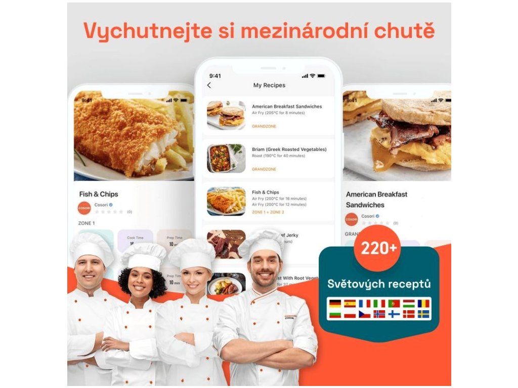 Cosori TwinFry bol navrhnutý v Kalifornii a vyvinutý tímom kuchárov Cosori. Aplikácia obsahuje viac ako 200 medzinárodných receptov, ktoré môžete vďaka jednoduchosti varenia vo fritéze ľahko pripraviť pre svojich blízkych.