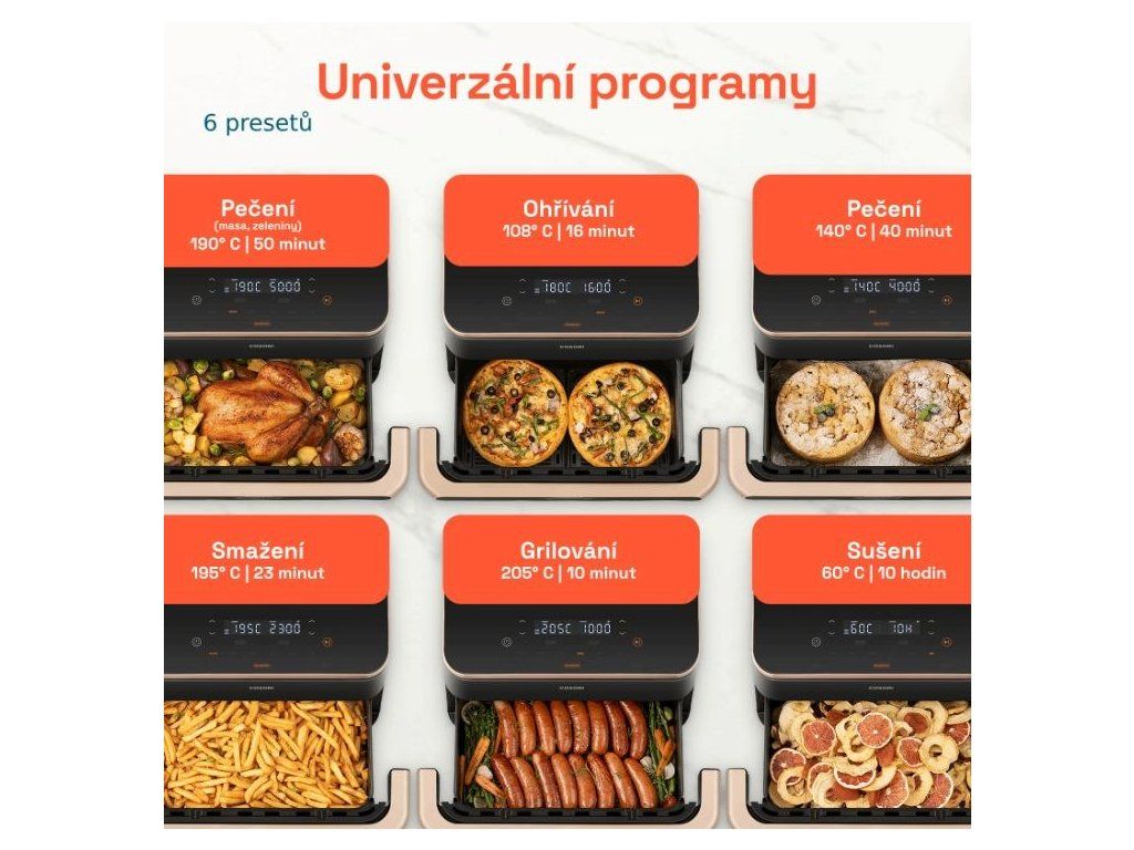 Vďaka šiestim programom dokáže Cosori TwinFry piecť, smažiť, grilovať, piecť sladké a slané pokrmy a dokonca aj sušiť. Nezáleží na tom, či potrebujete celý 10l kôš alebo len jeho polovicu. Rozdelením koša môže fritéza pripravovať dva nezávislé pokrmy, čo je užitočné najmä pri príprave jedla a prílohy súčasne. Ovládanie je také pohodlné a intuitívne, že sa varenie stane otázkou niekoľkých dotykov, a nie celodenného postávania pri kuchynskej linke.