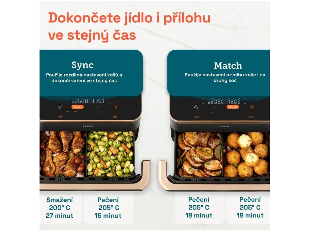 Fritéza má dômyselnú funkciu Sync. Ak rozdelíte kôš na dve časti a chcete pripraviť dve rôzne jedlá, stlačením tlačidla Sync synchronizujete prípravu a ukončíte ju v rovnakom čase. Hotový vedľajší pokrm sa nevysuší, kým čakáte na prípravu hlavného jedla. Funkcia Match vám potom umožní rýchlo nastaviť rovnaký program v oboch košoch bez toho, aby ste museli robiť to isté dvakrát.
