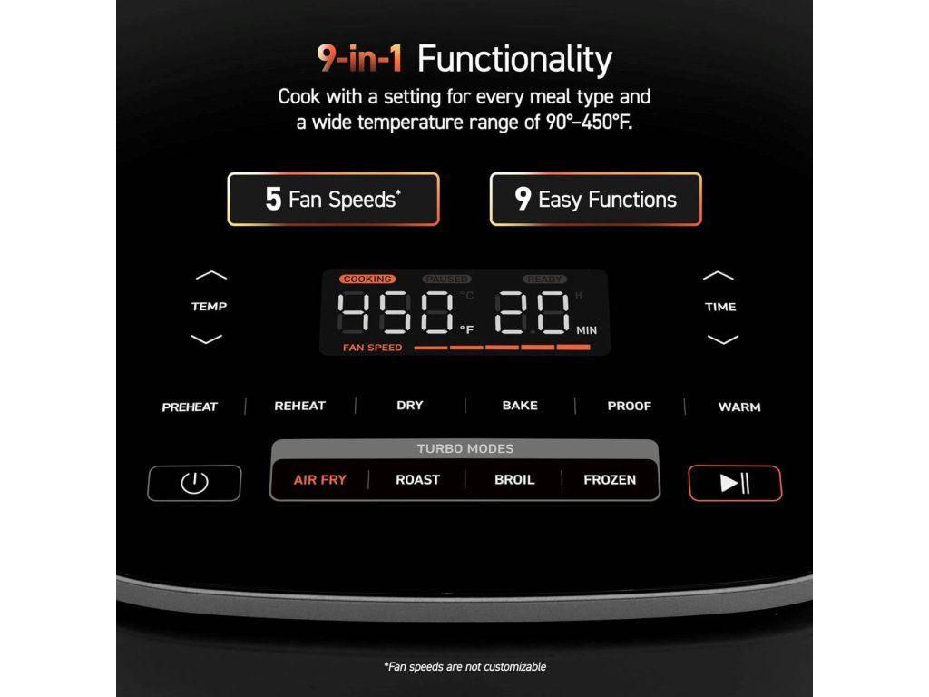 - 9 funkcií: fritovanie, pečenie mäsa, pečenie sladkých výrobkov, grilovanie, sušenie ovocia alebo zeleniny, príprava mrazených potravín, ohrievanie, kysnutie, predhrievanie a udržiavanie teploty