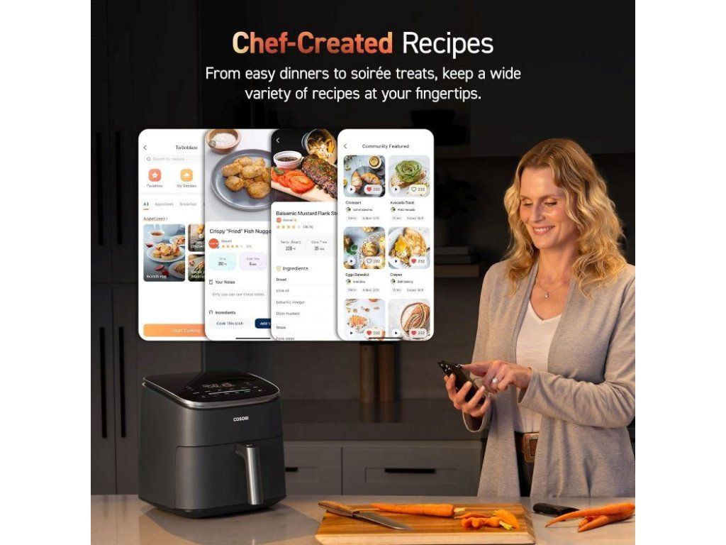 K fritéze Cosori TurboBlaze si môžete stiahnuť našu bezplatnú aplikáciu VeSync, ktorá vám umožní spestrenie vášho jedálnička vďaka viac ako 100 obsiahnutým receptom od našich profesionálnych šéfkuchárov.
