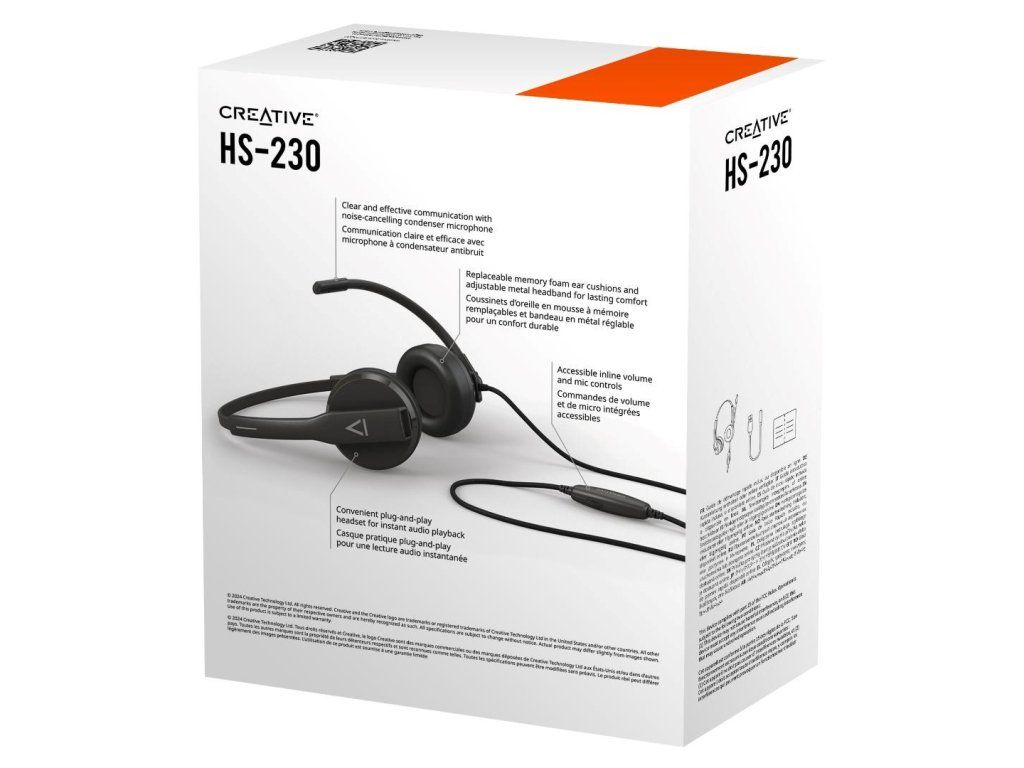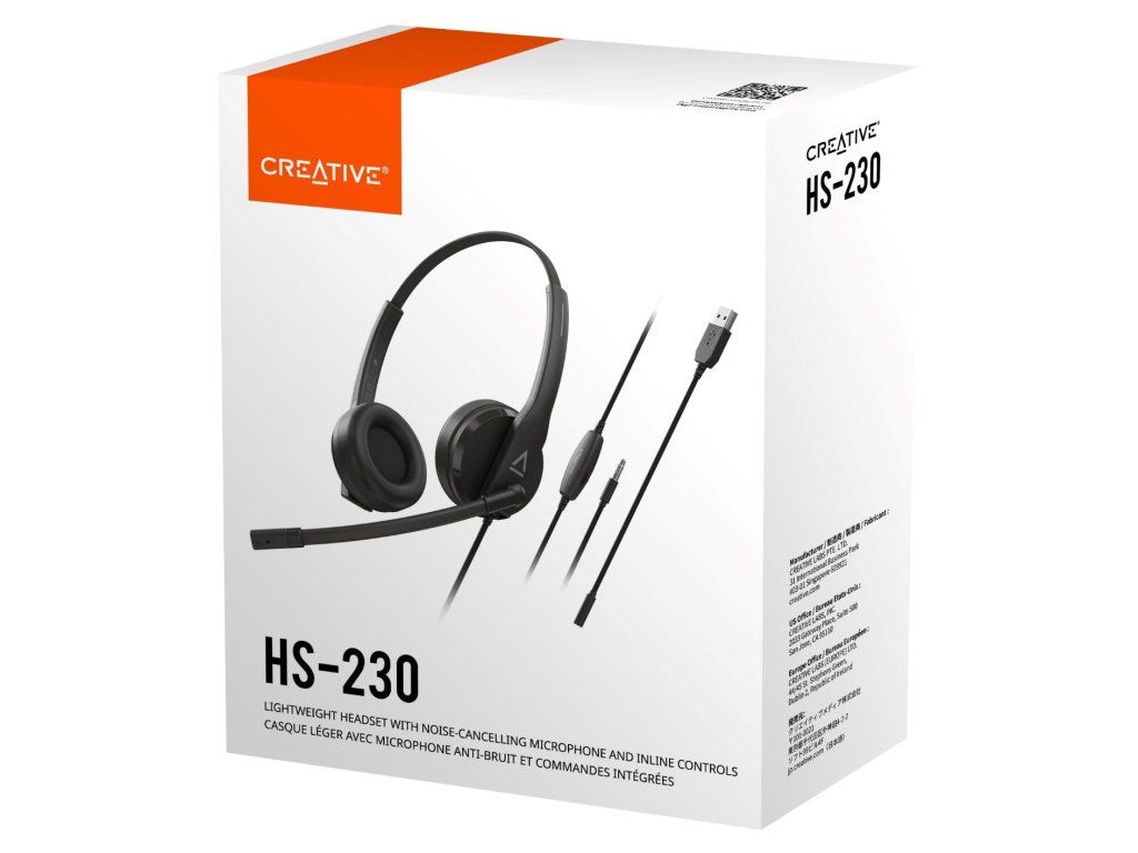 Creative HS-230 je ľahká analógová náhlavná súprava vybavená odnímateľným mikrofónom s potlačením okolitého hluku, ovládaním na kábli a možnosťou pripojenia cez USB adaptér. Je ideálna pre firemné hovory, videokonferencie aj bežné používanie na PC a Mac bez nutnosti inštalácie ovládačov.