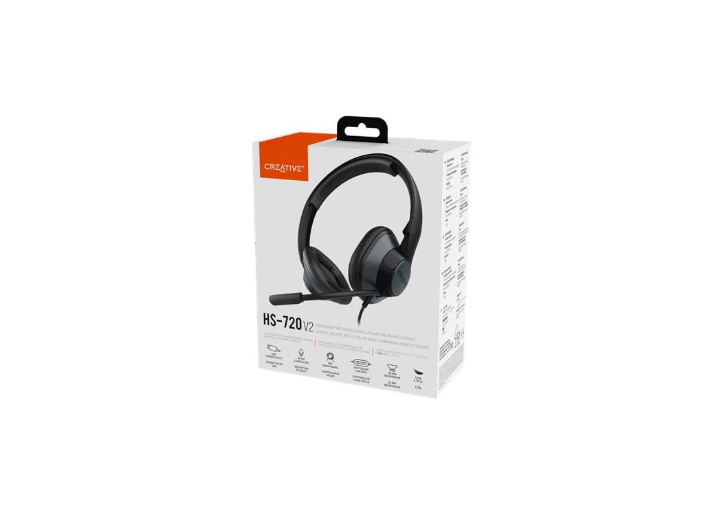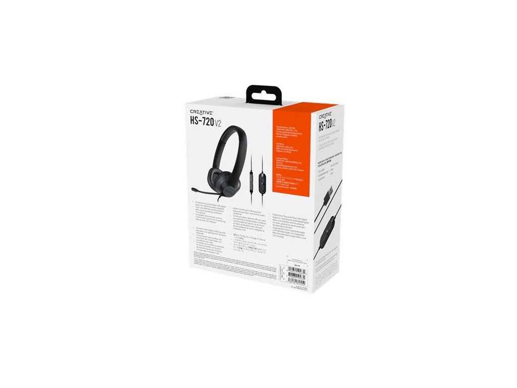 Sluchátka USB vybavená kondenzátorovým mikrofonem s potlačením šumu a dálkovým ovladačem na kabelu s tlačítkem ztlumení mikrofonu pro videohovoryKomunikujte srozumitelně a sebejistě pomocí naší nejnovější náhlavní sady USB Creative HS-720 V2! Modernizovaný model Creative HS-720 V2 dostal nový decentní vzhled a je optimalizován pro schůzky online. Je to jednoduchá náhlavní sada plug-and-play, která funguje s každým počítačem PC nebo Mac, a je tak lehká, že ji můžete pohodlně a bez problémů používat dlouhé hodiny.
