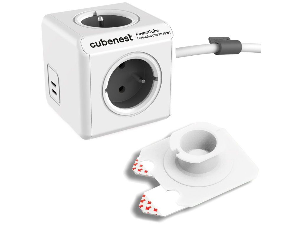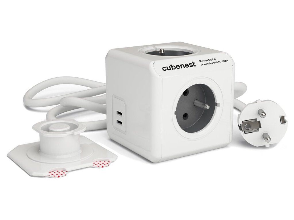 Cubenest Powercube Extended USB PD 35W, 2xUSB-C, 4× zásuvka, 1,5m, bílá/šedá, dětská pojistka, uzemnění, montážní dok PC435GY
