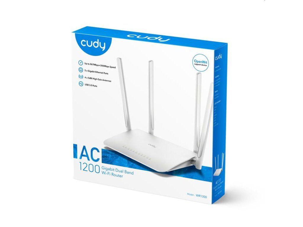 AC1200 Dual Band Wi-Fi Router, Model: WR1300 - AC1200 Dual Band Wi-Fi Speed - High Performance Dual Core CPU - 16MB Flash and 128MB DDR3 - 5 x Gigabit Ethernet Ports - 4 x 5dBi High Gain Antennas - VPN Clients and DDNS Support - 5-IN-1 WiFi Router/ Mesh/Repeater/ WISP/ Access Point Specifications Hardware Features Processor Dual-Core CPU Flash 16MB DDR 128MB Antenna 4× Fixed Omni-Directional Antennas Interface 1× 1000/100/10 Mbps WAN Port 4× 1000/100/10 Mbps LAN Ports Button WPS Button, Reset Button External Power Supply 12 V / 1 A Dimensions ( W x D x H ) 204.8 x 137. 5 x 38. 3mm Wireless Features Wireless Standards IEEE 802.11ac/n/a 5 GHz IEEE 802.11n/b/g 2.4 GHz Frequency 5 GHz, 2.4 GHz Signal Rate 867 Mbps (5 GHz), 300 Mbps (2.4 GHz) Compatible with 802.11a/b/g/n/ac Wi-Fi standards Transmit Power CE: <20dBm(2.4 GHz), <23dBm(5.15 GHz~5.25 GHz) FCC:<30dBm(2.4 GHz & 5.15 GHz~5.825 GHz) Wireless Modes Enable/Disable Wireless Radio, WMM WEP, WPA/WPA2, Wireless Functions WPA-PSK/WPA2-PSK Software Features WAN Type Dynamic IP/Static IP/PPPoE Management Parental Control Guest Network DHCP Server, DHCP Client List, Address Reservation Dynamic DNS Compatible with 15 more DDNS providers Guest Network 2.4 GHz guest network × 1 5 GHz guest network × 1 NAT Port Forwarding, Port Triggering, UPnP, DMZ VPN Client PPTP/L2TP/OpenVPN/WireGuard Others Package Contents AC1200 Wi-Fi Router Power Adapter RJ45 Ethernet Cable Quick Installation Guide System Requirements Microsoft Windows 98SE/NT/2000/XP/Vista™/7/8/8.1/10, MAC OS, NetWare, UNIX or Linux Internet Explorer 11, Firefox 12.0, Chrome 20.0, Safari 4.0, or other Java-enabled browser Cable or DSL Modem Subscription with an internet service provider (for internet access)Dodatočné parametre
