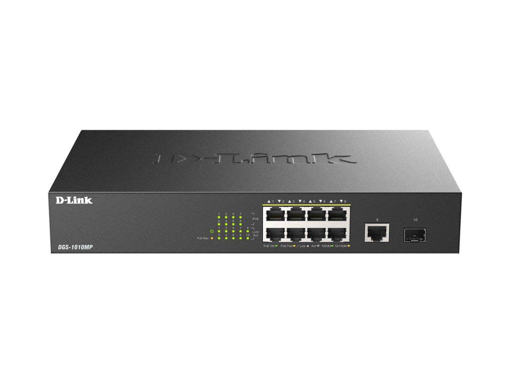 10-Port Gigabit PoE Switch DGS-1010MP/E DGS-1010MP je inteligentní síťové řešení, které spojuje výkon, jednoduchost a efektivitu – ideální pro rozšíření připojení s minimální námahou a maximální spolehlivostí v kompaktním provedení. * Vysokorychlostní síť s osmi 10/100/1000 Mbps PoE Ethernet přístupovými porty * Jeden Gigabit Ethernet a jeden SFP uplink port pro uplink připojení * Plug-and-Play instalace * Přepínání typu Store-and-forward maximalizuje výkon sítě * Kompaktní a tichý design * Zelená technologie Web výrobce: https://www.dlink.com/cz/cs/products/dgs-1010mp-10-port-gigabit-poe-switchDodatočné parametre