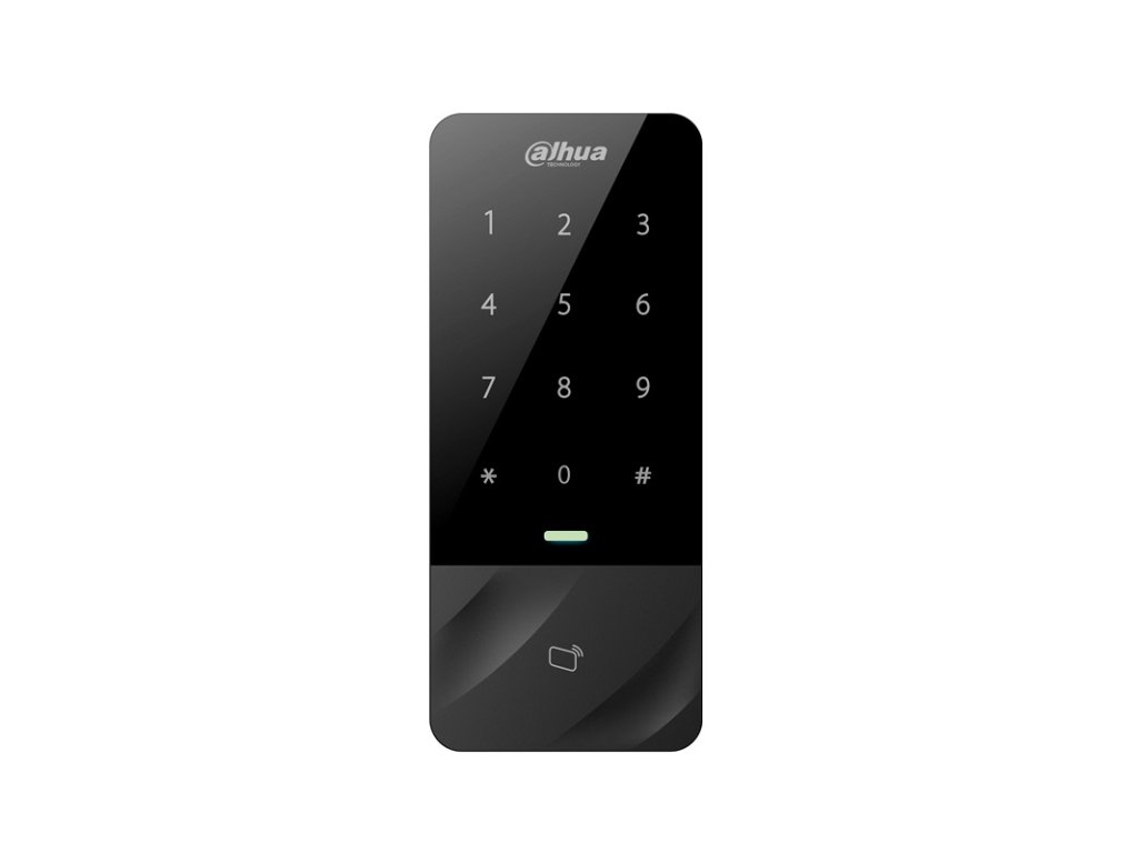 Autonómna prístupová čítačka RFID s kódovou klávesnicou, čítanie bezkontaktných kariet (MIFARE, 13,56 MHz), kapacita 30.000 užívateľov, 60.000 záznamov, pripojiteľná podružná Dahua RFID čítačka z opačnej strany dverí (funkcia Anti-pass back), 1x NO/NC ovládanie zámku, pripojiteľnosť odchodového tlačidla a dverného senzora, tamper, možnosť pripojenia TCP/IP a manažmentu cez prístupový softvér smart PSS, zvuková a LED signalizácia, napájanie 100 mA / 9–15 V DC (zdroj nie je súčasťou), IP 67 pre vonkajšie a vnútorné použitie, plast, montáž na omietku, rozmery 62 x 142 x 23 mm