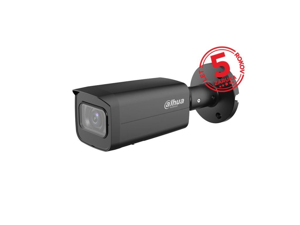 5 Mpx kompaktná IP kamera, exteriérová, IR LED s dosvitom 80 m, 1/2.7" 5 Megapixel CMOS, rozlíšenie 2594 x 1944 px @ 20 fps, 2688 x 1520 px @ 25 / 30 fps, citlivosť 0,005 lx @ F 1.6 (Color, 30 IRE), objektív 2,8 mm, uhol záberu H: 102°, V: 71°, D: 131°, AWB, BLC, HLC, WDR, 3DNR, kompresia H.265 / H.264H / H.264B / MJPEG (Sub Stream), podpora smart codec, IVS, Perimeter Protection, Tripwire, SMD 3.0, Face Detection , People Counting, Smart Search, Heatmap, ONVIF kompatibilné, slot na MicroSD kartu až 256 GB, RJ-45, napájanie 12 V DC / PoE(802.3af), ePoE, pracovná teplota od -40 °C do +60 °C, IP 67, IK 10, rozmery 244,1 x 79,0 x 75,9 mm, hmotnosť 0,815 kg