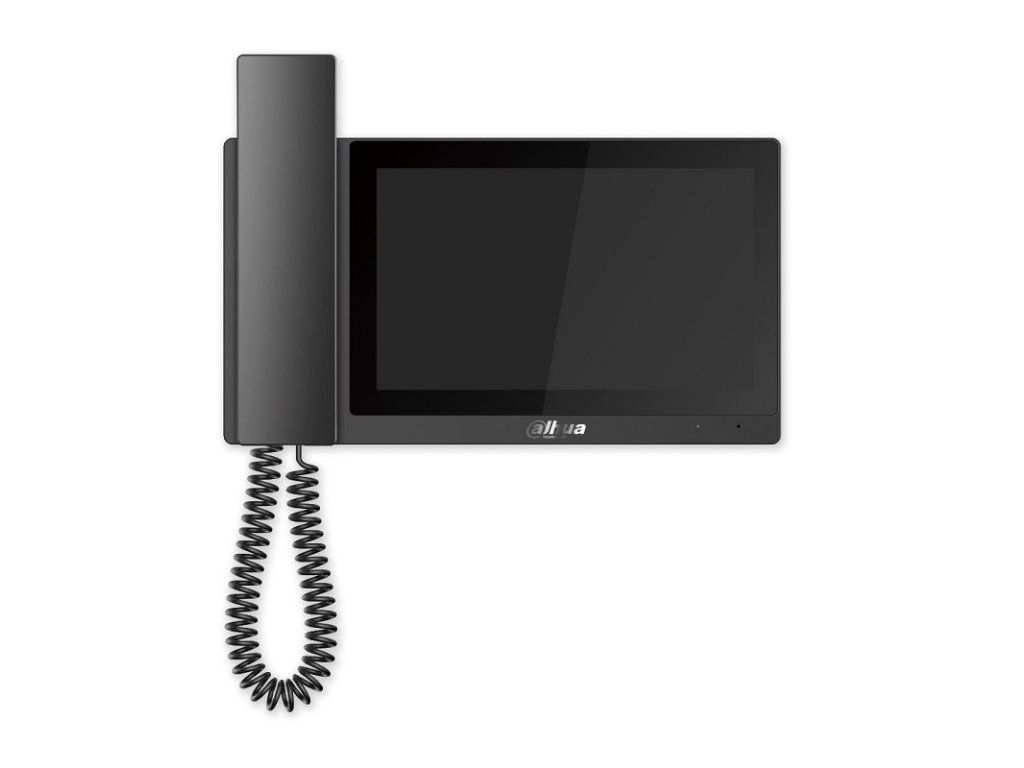 IP Dahua videomonitor, prevedenie čierny plast, 7“ dotykový LCD displej s rozlíšením 1024 x 600 px, H.264 kompresia. TCP/IP komunikácia, Wi-fi, grafické prehľadné menu, možnosť vytvorenia obrázkov pri neprijatom hovore po vložení micro SD karty (nie je súčasťou balenia) max. podporovaná kapacita SD karty až 32 GB, možnosť pripojiť až 20 dverných jednotiek a 8 externých CCTV Dahua IP kamier, podpora video hovoru / push notifikácie na Android a iOS mobilné telefóny cez internet (aplikácia DMSS), 1x RJ-45 konektor pre pripojenie do siete, 6x NO kontakt pre pripojenie alarmových vstupov, 1x NO alarmový výstup, ovládanie 2 zámkov, možnosť prizvonenia od dverí, napájanie externým zdrojom 12V / 1000 mA (zdroj nie je súčasťou balenia), alebo PoE 802.3af switchom, ak používate externý zdroj a funkciu Wi‑Fi, použite zdroj 12 V DC / min. 2 A, montáž na povrch, rozmery 236,0 x 129,8 x 23,0 mm, interiérové použitie.