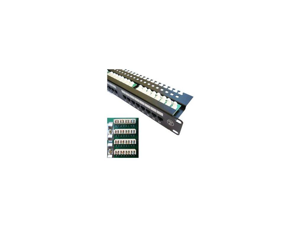 19'' patchpanel 24 portů, osazený, nestíněný UTP, CAT.5e - s vyvázáním, výška 1U - LSA (Krone) - celokovový - konektory (RJ-45) se zasunují kolmo - obrázek v kartě downloadDodatočné parametre