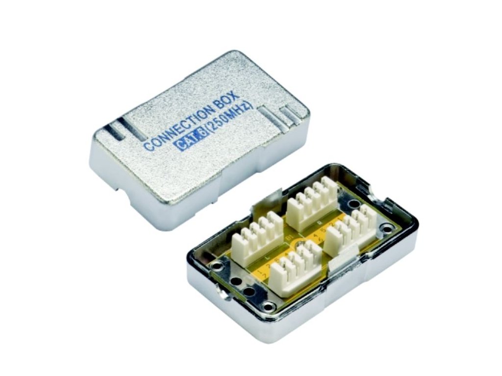 Spojovací BOX STP CAT.6 (2* zářez. pole), stříbrný Stíněná spojka CAT.6 pro spojení dvou kabelů pomocí zářezového pole. Koncovky: Zářezové pole LSA - Zářezové pole LSA Zapojení pinů: 1-1 2-2 3-3 4-4 5-5 6-6 7-7 8-8 S-S Rozměry: (V) 26 mm x (D) 69 mm x (Š) 41 mmDodatočné parametre