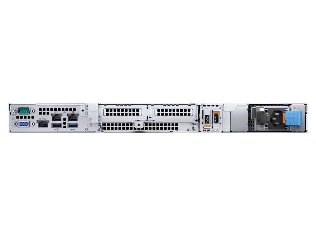 Integrovaný Broadcom 5720 Dual Port 1Gb LOM pro síťové připojení, dva PCIe Gen4 sloty pro rozšiřující karty a kompletní sada portů včetně USB, VGA a sériového portu pro lokální správu.