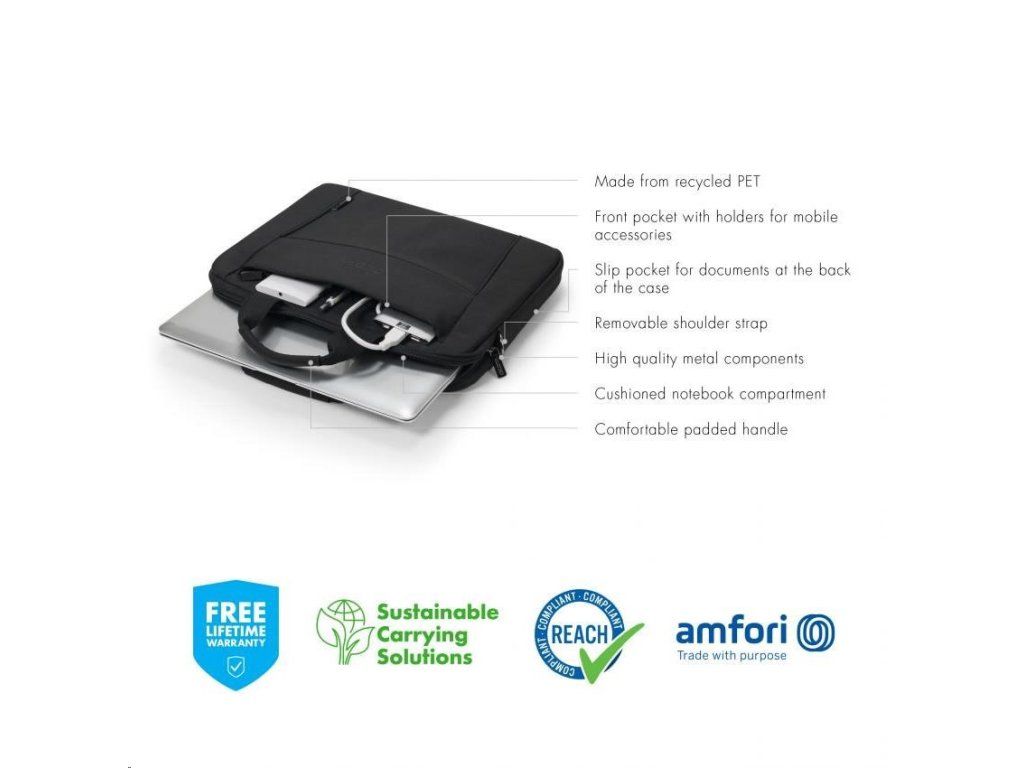 Eco Slim Case BASE je ľahké, tenké puzdro na notebook. Zariadenia od 13 do 14 rokov.1" sú dobre chránené v polstrovanej priehradke na notebook. Kufrík sa pohodlne prenáša vďaka polstrovanej rukoväti a nastaviteľnému ramennému popruhu. Dodatočná priehradka na zadnej strane je obzvlášť praktická na jednoduché ukladanie dokumentov. Smartfón alebo iné menšie predmety, ako sú káble, perá alebo nabíjačky, si môžete uložiť do praktického predného vrecka, aby ste ich mali vždy po ruke. Puzdro Eco Slim Case BASE je preto pre vás ideálne, ak ste stále na cestách a chcete podporiť recykláciu PET fliaš ekologickým puzdrom.