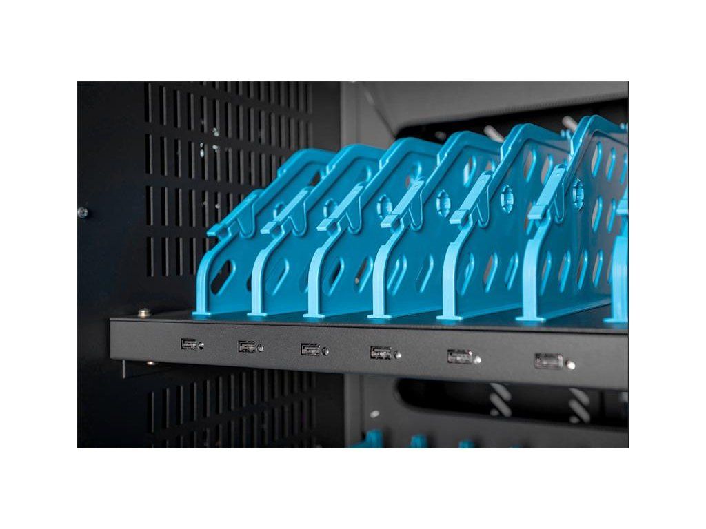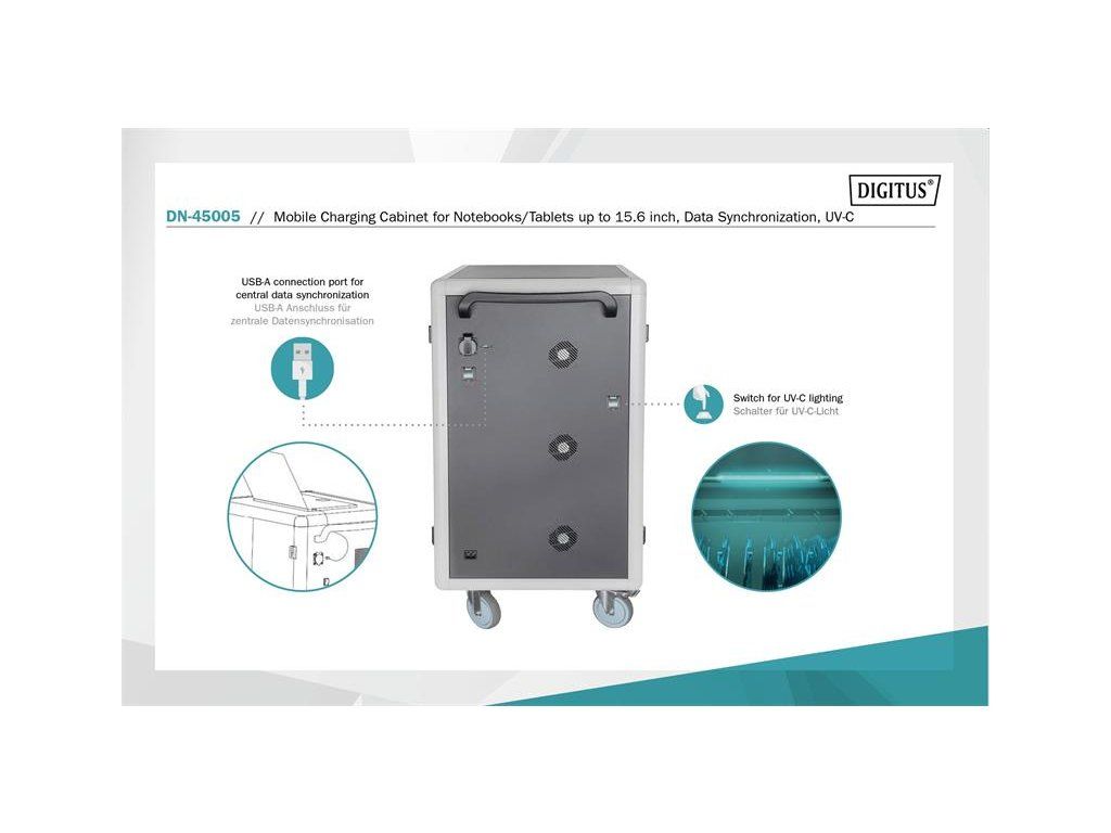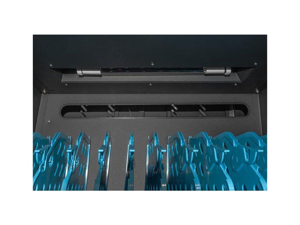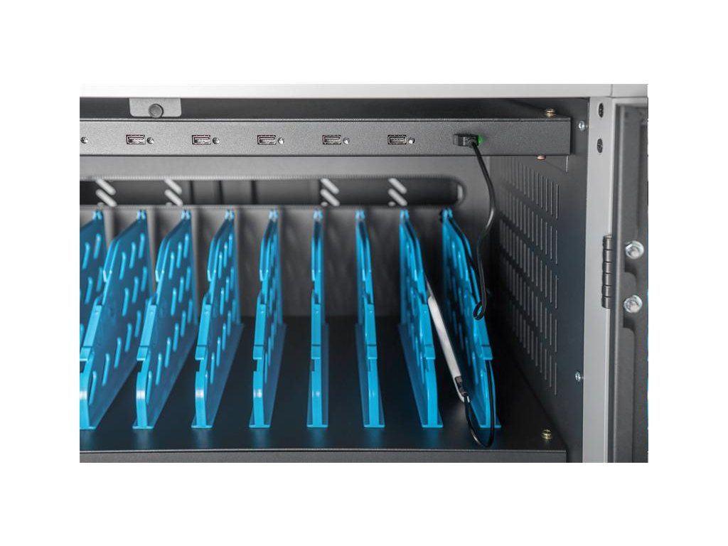 Nabíjecí vozík pro notebooky a tablety, 30 nabíjecích základen, černý 1100 x 700 x 600 mm, vč. USB, synchronizace dat, UV-C Osvětlení-Sterilizace , PDU, ventilátor Ideální řešení pro ukládání a nabíjení přenosných zařízení. 30 stanic (3x10) 40 x 300 mm pro zařízení (vhodné až pro 15,6 " zařízení) 30 x připojení USB 3 x zásuvka na zadní straně (10 x bezpečnostní zdířky včetně spínače) Průchodka kabelů a možnost uložené rezervy kabelů na každé úrovni Kompaktní box, mobilní díky nainstalovaným kolečkám - dvě s brzdou proti nechtěnému posunu. Mobilní nabíjecí skříň od společnosti DIGITUS® je ideálním a kompaktním řešením pro ukládání a nabíjení přenosných zařízení, jako jsou notebooky a tablety. Mobilní nabíjecí skříňky se často používají ve veřejných zařízeních, jako jsou školy, aby bezpečně ukládaly zařízení na centrálním místě a současně je nabíjely. Skříňka obsahuje 3 řady s 10 nabíjecími stanicemi, z nichž všechny mají na přední straně své vlastní připojení USB. Zařízení lze také připojit s nainstalovanými zásuvkovými lištami (3 x 10 bezpečnostních zdířek) na zadní straně. Díky dostatečným průchodům a možnosti uložení kabelů je zaručena optimální správa kabelů. Nainstalované ventilátory (3 x 24 V) v kombinaci s větracími štěrbinami zajišťují aktivní chlazení skříně. Instalované UV-C lampy zajišťují sterilní podmínky, a tím i šetrnost k životnímu prostředí a zvýšenou hygienu. Pro centralizovanou synchronizaci dat lze k externímu portu USB připojit zařízení. Technické údaje Dvojité skládací přední a zadní dveře Klička s otočnou rukojetí páky na předních a zadních dveřích, uzamykatelná Úhel otevření dveří 180 ° Dvoubodové zamykání (tyčový zámek) Včetně 4 koleček (2 uzamykatelné) Včetně úchytů pro lepší mobilitu (přiloženo) Hloubka vnitřní přihrádky: 415 mm (vhodné pro zařízení do 15,6") Rozměry výrobku (V x Š x H) v mm: 1100 x 700 x 600 mm Bezpečnostní zásuvka (AC) se spínačem na boku Připojení C20 na boku Včetně RCD 30 mA (zařízení se zbytkovým proudem) 30x USB-A (5V/2,1A - 10W na zařízení), celkový výkon max. 300W Obsah balení Mobilní nabíjecí box 2 x držadlo (pro instalaci venku) včetně montážního materiálu Napájecí kabel Charging trolley, 15.6", USB-A, UV-C, Data-Synch. 30 charge bases, PDU, fan, 1260 x 824 x 650 mm The ideal solution for sterile storage and charging your portable devices via USB-A connections. Including option for data synchronization. 30 stations (3x10) for devices 30 x USB connection 3 x socket strip installed on the back (10 x safety sockets including switch) Cable feedthrough and excessive cable storage on each level Compact housing, mobile thanks to installed rollers 3 x ventilator (24 V) for active cooling of the cabinet Incl. RCD 30 mA (residual current operated device) 3 x ventilator (24 V) for active cooling of the cabinet Incl. ground fault circuit interrupter 30 mA DESCRIPTION The mobile charging cabinet from DIGITUS® is the ideal and compact solution for storing and charging your portable devices such as notebooks and tablets. Mobile charging cabinets are frequently used in public facilities such as schools in order to store devices securely at a central location while charging them at the same time. The cabinet includes 3 rows with 10 charging stations each, all of which have their own USB connection on the front. The devices can also be connected with installed socket strips (3 x 10 safety sockets) at the back. Thanks to ample cable feedthroughs and excess cable storage, optimal cable management is guaranteed. Installed ventilators (3 x 24 V) combined with ventilation slits ensure active cooling of the cabinet. Installed UV-C lamps ensure sterile conditions and thus environmentally friendly, enhanced hygiene. For centralized synchronization of data, a device can be connected to the external USB port. TECHNICAL DETAILS Casters can be dismantled if necessary USB-A Port Output: 10W (5 V 2.1A) per port; 300W max. Temperature control: Fans start automatically when the internal temperature exceeds 40 °C Color: black, RAL 9005 PACKAGE CONTENT Mobile charging cabinet 2 x handle (for installation on outside) including mounting material Power cable User manualDodatočné parametre