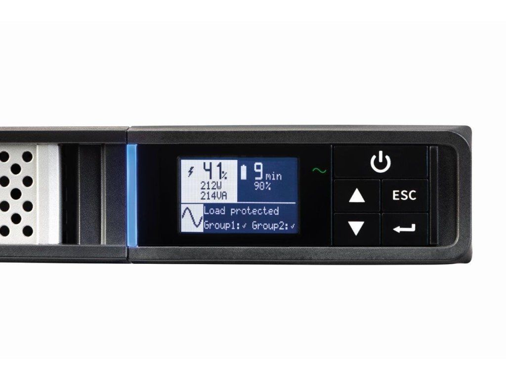 - Nový grafický LCD displej poskytuje na jednej obrazovke základné informácie o stave UPS a o meraných veličinách (v siedmich jazykoch podľa voľby). K dispozícii sú aj rozšírené možnosti konfigurácie pomocou zrozumiteľných navigačných tlačidiel.