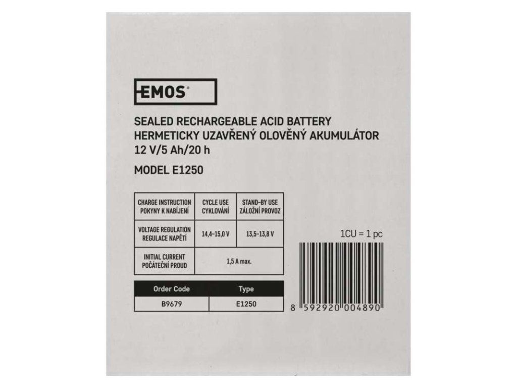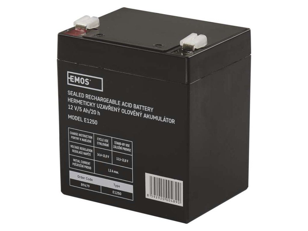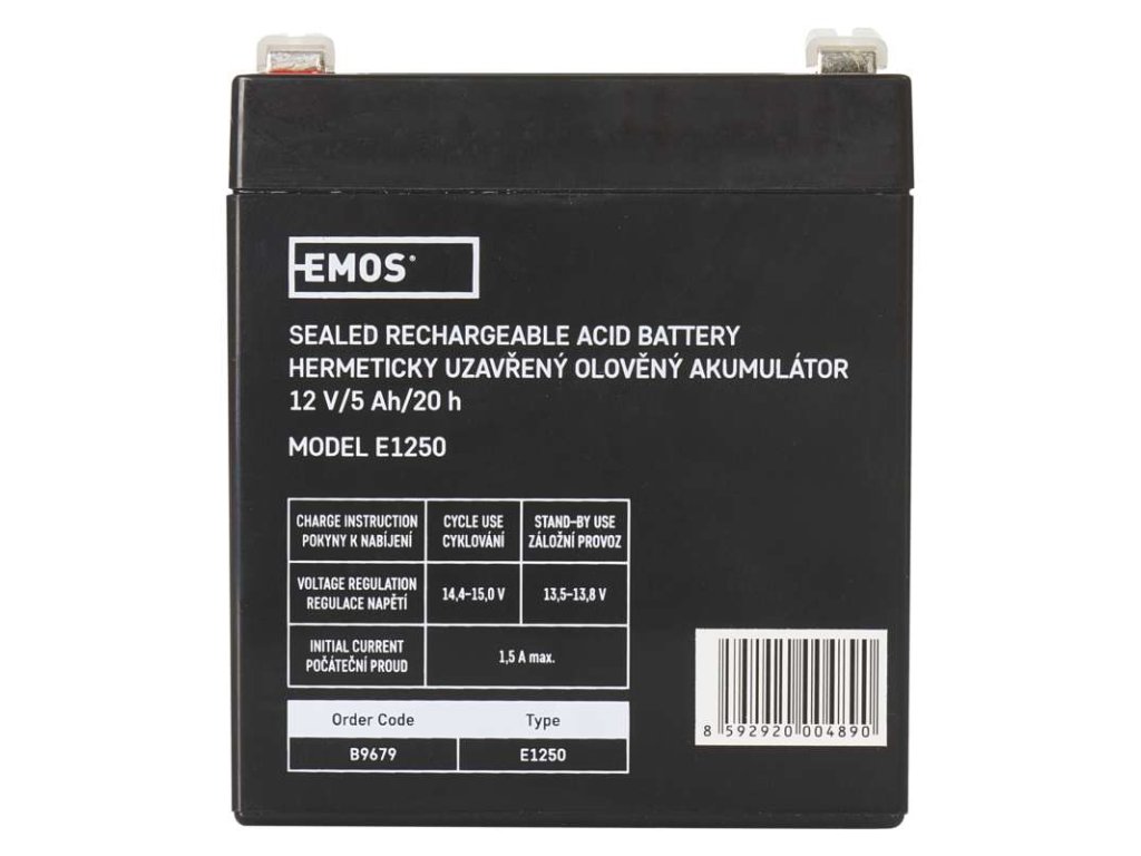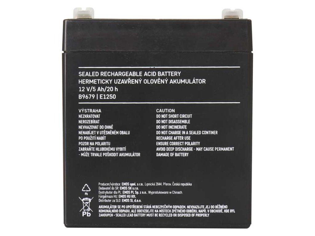 Bezúdržbový olovený akumulátor EMOS B9679 s napätím 12 V a kapacitou 5 Ah je vhodný ako náhradná batéria pre záložné zdroje UPS, RBC kity, záhradné kosačky a pod. Prevedenie AGM umožňuje použitie v ľubovoľnej polohe. Batéria sa musí nabíjať vhodným zdrojom s napätím 14,4 V, pri nedodržaní tejto hodnoty môže batéria stratiť svoju kapacitu.