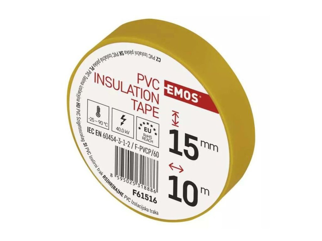 Emos Izolační páska PVC 15/10 žlutá PVC 0,13 mm x 15 mm x 10 m Technické parametry: tloušťka 0,13 mm +- 0,02 mm šířka 15 mm +- 1,0 mm délka 10 m +- 0,5 m pevnost v tahu min. 150 N/10 mm prodloužení min. 125% el. pevnost min. 40 kV/mm el. pevnost po vlhku min. 35 kV/mm zkouška plamenem <1 sec. přilnavost k oceli min. 1,8 N/10 mm přilnavost k podkladu 1,5 N/10 mm skladovat při teplotě +10°C až +60°C používat při teplotě +5°C až +60°C vyhovuje normě ČSN EN 60454-3-1-2/F-PVC/60Dodatočné parametre