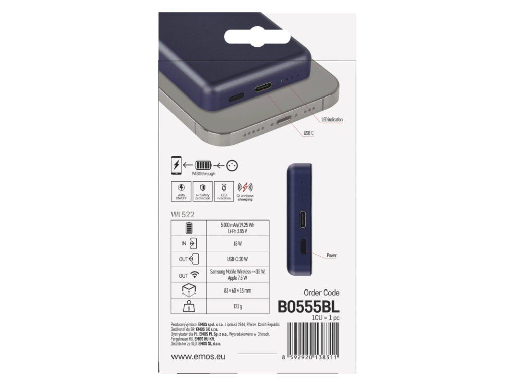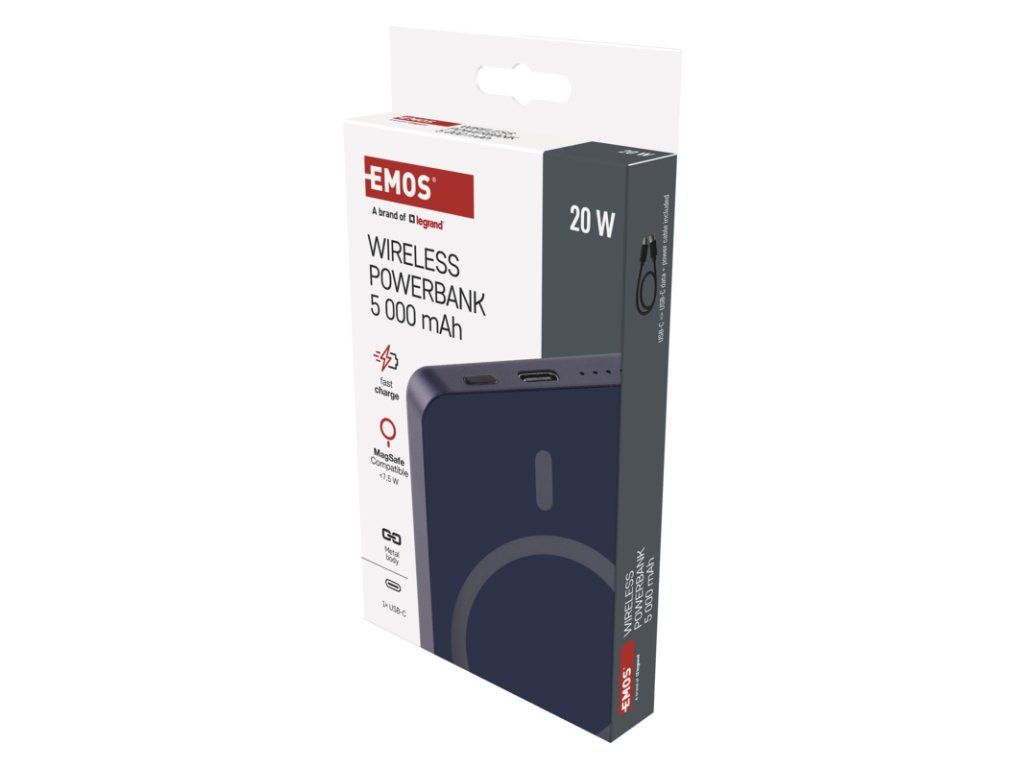 EMOS POWERBANKA WI 522, bezdrôtové nabíjanie 20W, 5.000mAh, MODRÁ, 1xUSB-C 1613055502