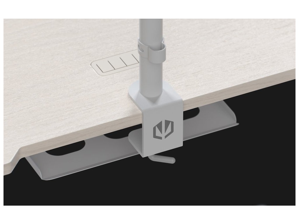 Stůl nabízí komplexní systém pro organizaci kabelů, včetně pogumované průchodky v rovině s deskou a diskrétní police na napájecí lištu. Výřez na zadní hraně umožňuje elegantní uchycení držáku monitoru bez poškození stěny.