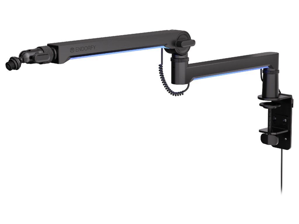 Endorfy Broadcast Low Profile RGB Boom ArmNastavitelné rameno s vícebarevným podsvícením a 3 klouby pro ideální polohu mikrofonu při streamování nabízí jednoduchou a pevnou montáž pomocí šroubu ke stolní desce o tloušťce 15 až 105 mm. Stojan je vhodný pro všechny běžně používané mikrofony do hmotnosti až 2 kg. Díky kulové hlavě s 360° rotací a nastavitelným prodlužovacím segmentům (82 mm a 157 mm) můžete mikrofon umístit přesně podle svých potřeb. Předností jsou také vestavěné konektory USB a USB-C, systém pro skryté vedení kabelů či podpora 5/8", 3/8" i 1/4" závitů.