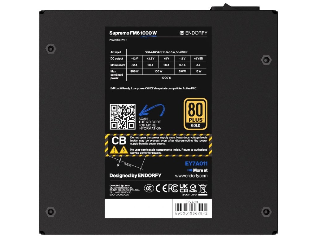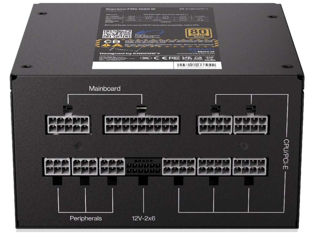 Napájecí zdroj Endorfy Supremo FM6 s vysokou účinností, který je navržen pro moderní PC sestavy zaměřené na náročný provoz. Certifikace 80 PLUS Gold je zárukou vysoké energetické účinnosti a stability. Kvalitní konstrukce, včetně prémiových kondenzátorů, zajistí dlouhou životnost.