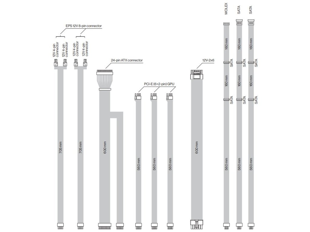 Napájecí konektory: 1× ATX 24pin, 2× EPS 12V 8pin, 3× PCIe 6+2pin, 1× PCIe 12+4pin (12V-2x6), 8× SATA, 1× molex