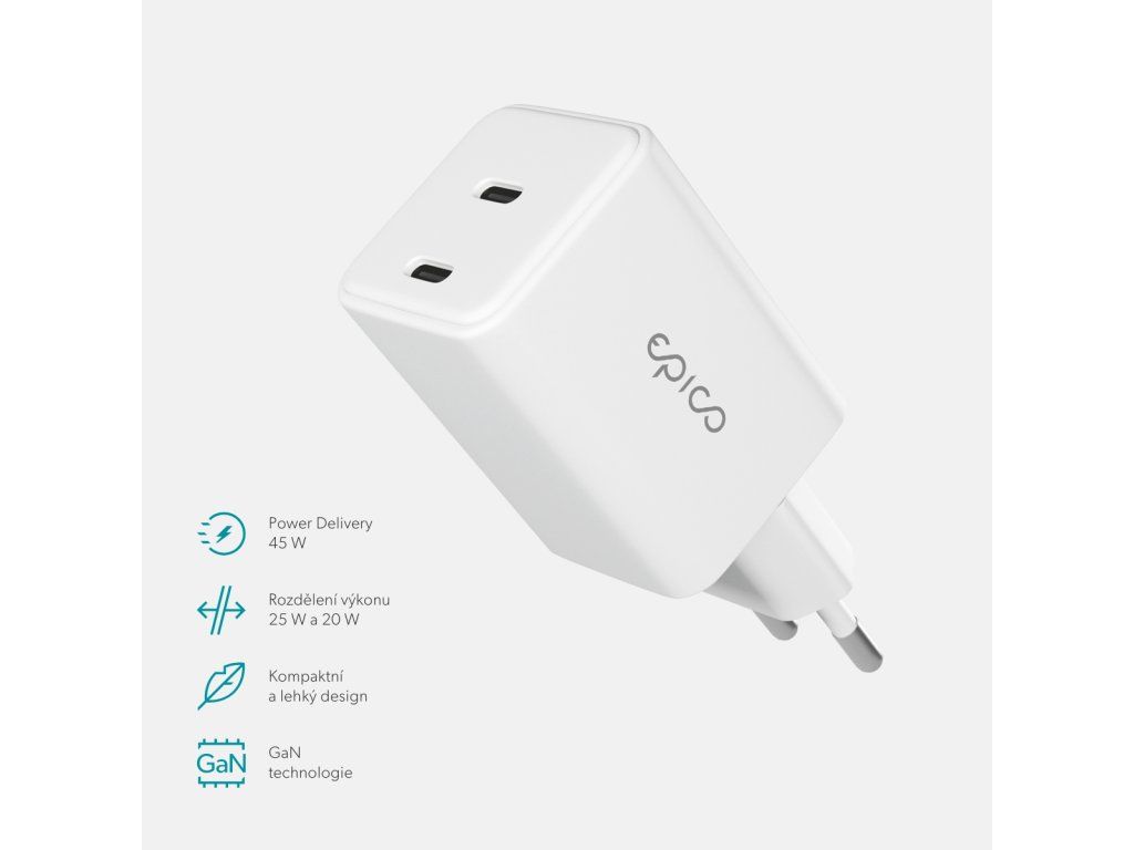 Efektivní nabíječka v malém těle Rychlé nabíjení 45 W: Ideální pro rychlé a spolehlivé nabíjení telefonů, tabletů, menších notebooků, a dalších zařízení. Dva USB-C porty: Dva USB-C porty s technologií Power Delivery umožňují nabíjet dvě zařízení najednou. Technologie GaN: Menší, chladnější a úspornější pro pohodlnější nabíjení. Ideální na cesty: Díky lehkému a kompaktnímu designu nabíječku snadno vezmete kamkoliv s sebou. Vestavěné bezpečnostní prvky: Spolehlivé nabíjení s ochranou proti zkratu, přepětí, přetížení a přehřátí.Dodatočné parametre