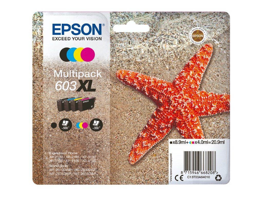 Epson 603XL multipack; Značková náplň pro vaši inkoustovou tiskárnu Epson zajistí maximální kvalitu tisku. ZÁKLADNÍ SPECIFIKACE; Pro tiskárny: Epson Expression Home XP-2100, XP-2105, XP-2150, XP-3100, XP-3105, XP-3150, XP-4100, XP-4105, WorkForce WF-2...