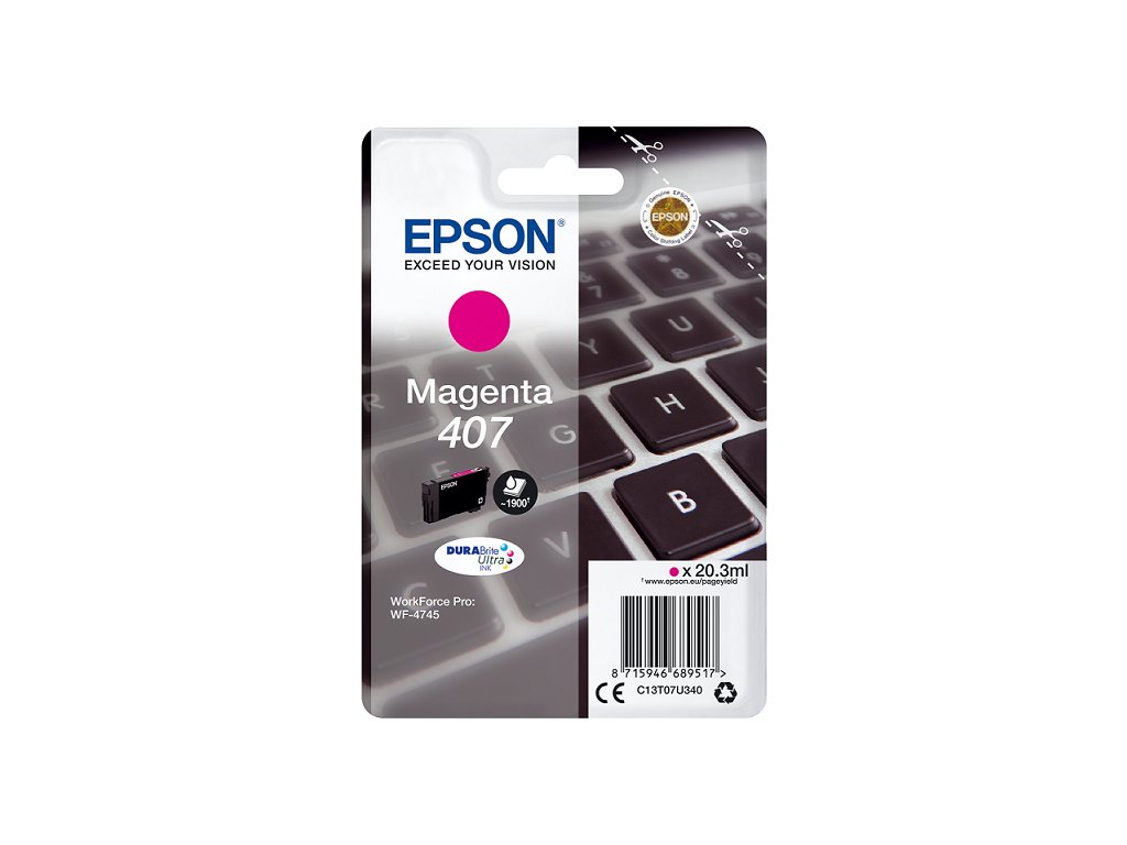 Originální cartridge Epson 407, C13T07U340 Barva: Purpurová (magenta) Výtěžnost: 20,3 ml Kompatibilní zařízení: WorkForce Pro WF-4745DTWFDodatočné parametre