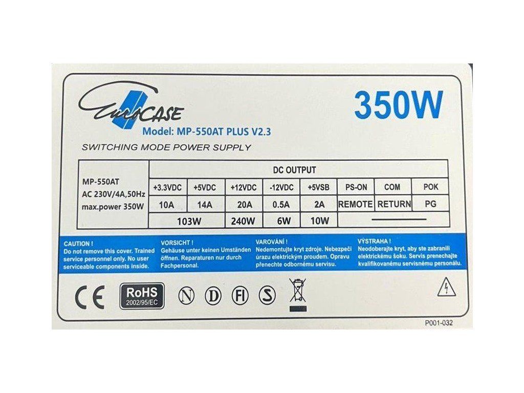 Napájací zdroj ATX značky Eurocase s výkonom 350W. Je osadený 120mm ventilátorom a pasívnym PFC (Power factor correction). Otáčky ventilátora sú riadené termoreguláciou. Zdroj spĺňa požiadavky na elektrickú bezpečnosť a elektromagnetickú kompatibilitu. Zdroj vyhovuje aj smernici 2005/32/EU = príkon v pohotovostnom režime.