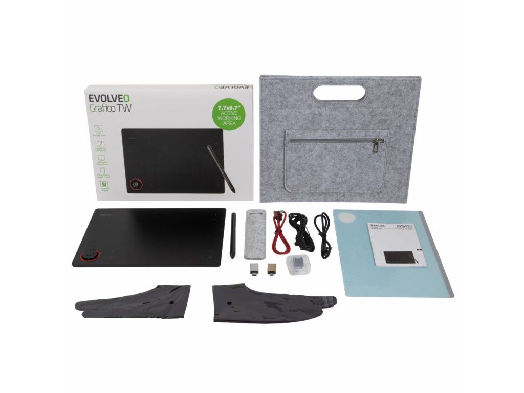• EVOLVEO Grafico TW, grafický tablet • Bezdrátové pero • Náhradní hroty – 30ks • USB • Uživatelský manuál • Micro-USB OTG adaptér • USB C OTG adaptér • Pouzdro na bezdrátové pero • Kroužek pro odstranění hrotů • Folie na pracovní plochu • Rukavice velikosti LPŘÍPLATKOVÉ PŘÍSLUŠENSTVÍ: