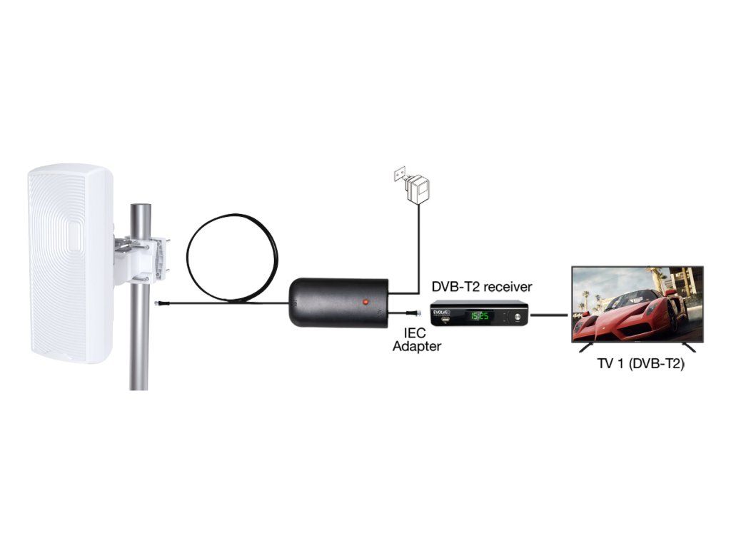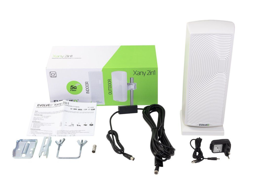 • anténa • zesilovač • držák • stojánek • adaptér 230V • kabel 8+2 m • redukce IEC female/F male • návod TECHNICKÁ PODPORA A SERVIS: podpora@evolveo.czDodatočné parametre