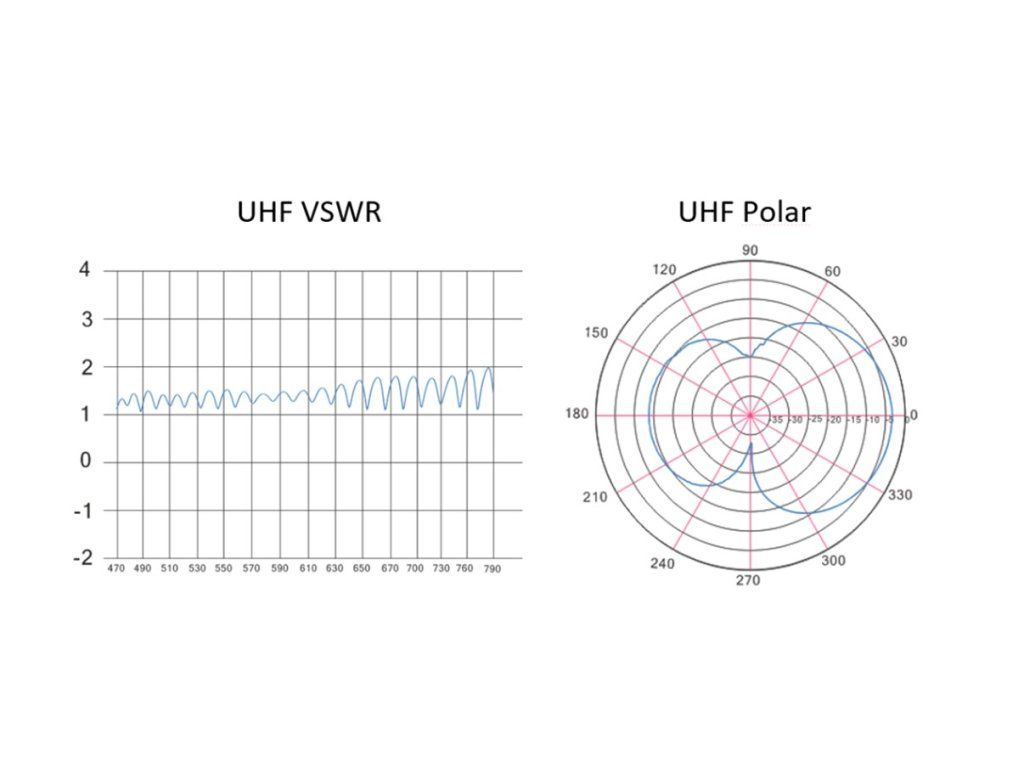 UHF VSWR graf zobrazuje účinnost antény v pásmu UHF. Koeficient rovný 1 znamená přeměnu všech elektromagnetických vln na elektrický signál. S grafem UHF Polar je možné pozorovat oblasti prostoru antény s nejlepším ziskem. Anténa Xany 2in1 je směrová, to znamená nejlepší příjem signálu v případě natočení antény k vysílači.Vše potřebné k montáži