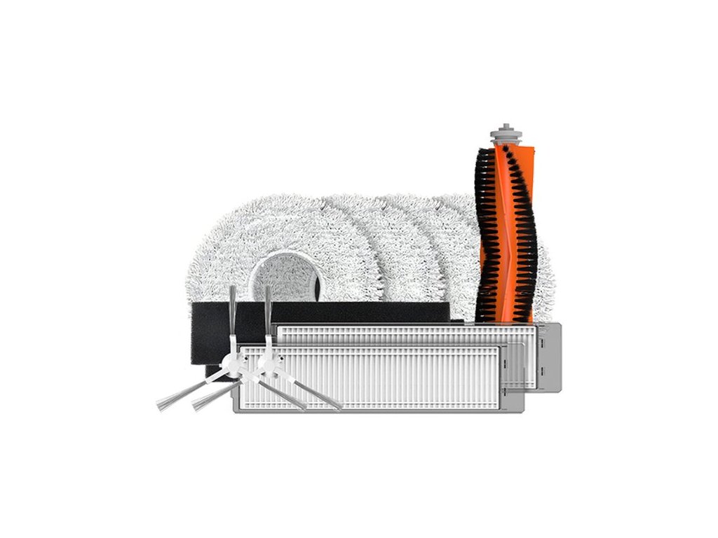 Sada příslušenství pro robotický vysavač EZVIZ RS2. Součástí balení je 1× hlavní kartáč, 2× boční kartáč, 2× utěrka na mop, 2× vysoce účinný filtr, 2× houbičkový filtr.