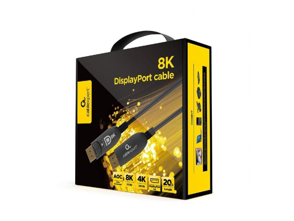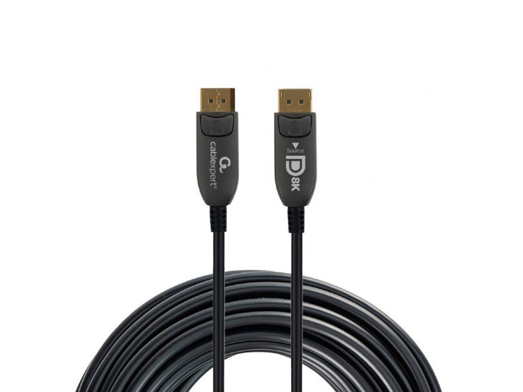 Aktívny optický (AOC) 8K kábel DisplayPort "AOC Premium Series", 20 m - Aktívne optické káble (AOC) využívajú technológiu optických vlákien na prenos digitálneho video signálu. To znamená, že signál môže byť prenesený oveľa ďalej ako s tradičným medeným káblom (až 100 m) a znižuje sa riziko EMI/RFI rušenia. Káble DisplayPort AOC majú vo vnútri aj vyhradené medené napájacie vodiče, takže nie je potrebné žiadne externé napájanie. Odolný extra tenký kábel prémiovej kvality so štýlovými kovovými konektormi. Podporuje rozlíšenie 8K UHD pri 60 Hz.