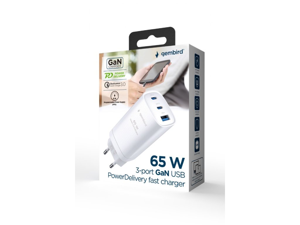 Gembird USB nabíječka s rychlým nabíjením * inteligentní ochrana proti přetížení, přepětí, zkratu a přehřátí * 2 porty USB-C s rychlým nabíjením - podpora QC 3.0 a PowerDelivery * vysoký výkon 65W pro váš smartphone nebo iPhone Porty: * 2x USB-C * 1x USB-A Napájení: AC100-240V ~50-60Hz až 1,5A (max. 360W) Celkový výkon: 65W Barva: bílá Rozměry: 106*39*34mm Hmotnost: 124g Záruka: 2 roky Odkaz na stránky výrobce: https://gembird.com/item.aspx?id=12867Dodatočné parametre
