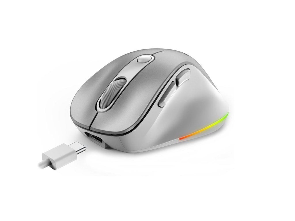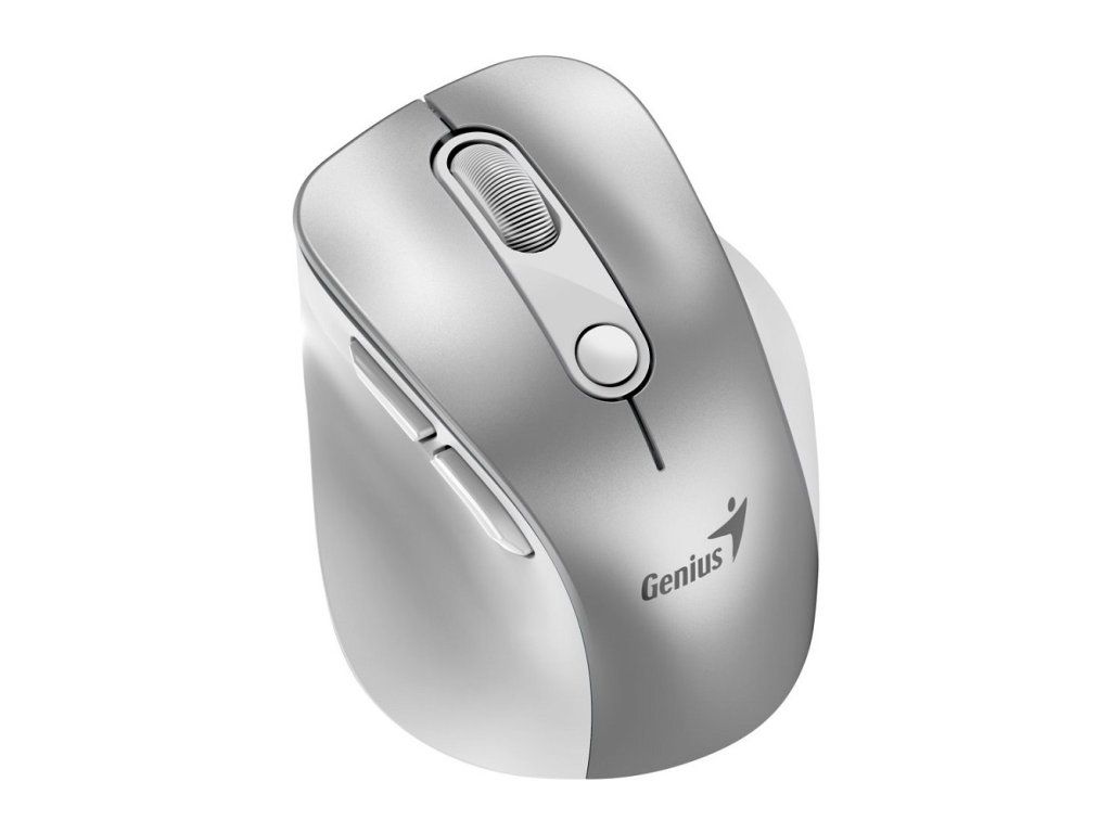 Genius Ergo 9000S Pro dobíjecí bezdrátová Bluetooth mini ergonomická tichá myš * duální režim: Bluetooth a 2,4GHz * připojení až ke třem zařízením * RGB podsvícení - 7 barev Technické parametry Počet tlačítek: 6 Rolovací kolečko: ano DPI: 800/1200 (výchozí)/1600/2400 Senzor: optický Rozhraní: bezdrátový přijímač USB 2,4GHz, Bluetooth 5.0, USB-C pro nabíjení Dosah: 10m Baterie: vestavěná dobíjecí 500mAh Systémové požadavky * 2,4GHz: volný port USB, Windows, macOS, Chrome OS * Bluetooth: Windows, macOS X, Chrome OS, iOS, iPadOS, Android Barva: stříbrná (Silver) Rozměry: 90,7×68,2×39,3mm Hmotnost: 65g Obsah balení: * bezdrátová BT mini ergonomická myš * přijímač USB * nabíjecí kabel USB-A na USB-C * uživatelská dokumentaceDodatočné parametre