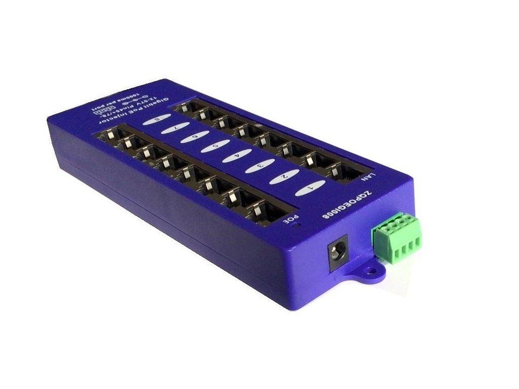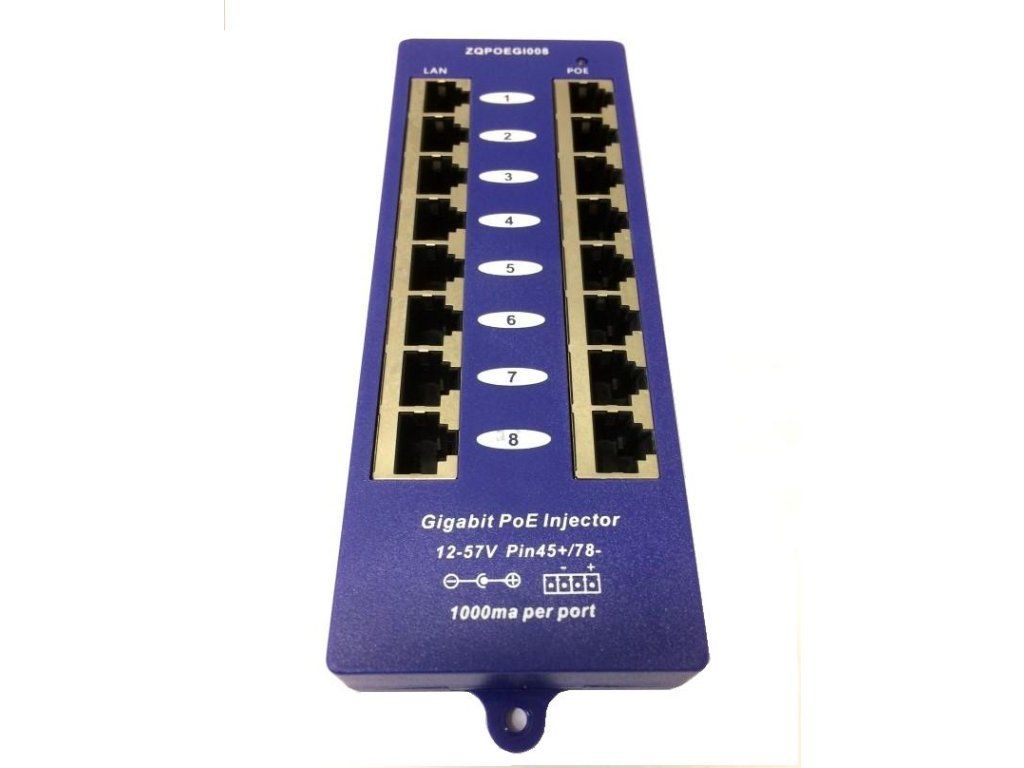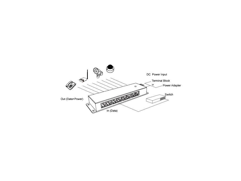 Panel integrující osm gigabitových pasivních POE injektorů s napájecím rozsahem 12-57V a max. proudem 1000mA/port. Univerzální řešení pro vzdálené napájení většího počtu aktivních prvků s integrovaným extraktorem po UTP kabeláži. Vstup pro napájení prostřednictvím standardního napájecího 2.1mm jacku nebo prostřednictvím panelového konektoru se svorkovnicí. Přidáním tohoto průchozího panelu do rozvaděče získáte napájecí centrum, které jednoduchým způsobem zapojíte mezi stávající switch a patchpanel, který již vede k napájenému zařízení (IP kamera, IP telefon, bezdrátové prvky, apod.). K napájení se využívají dva nepoužité páry ethernetového kabelu. Napájecí páry: 4,5 (kladný pól) / 7,8 (záporný pól) Rozhraní: 8x stíněný RJ45 konektor pro připojení do LAN (Data) 8x stíněný RJ45 konektor pro sloučený výstup (Data+Napájení) LED signalizace: Power OFF -- bez signalizace 4/5 (V+),7/8 (V-) -- zelená 4/5 (V-),7/8 (V+) -- červená Napájecí zdroj není součástí dodávky, volbu a výkonové parametry zdroje je třeba optimalizovat dle příslušných odběrů napájených prvků a jejich konfigurace. Technické specifikace: Vstup : 12-57V DC 2.1MM/Phoenix DC connector Výstup: 12-57V (max 1A per port) Data: 1/2&3/6&4/5&7/8 Napájení: 4/5 & 7/8 Data In :Connects PC/HUB/Switch Hmotnost : 160g Rozměry: 180mm×60mm×25mm Ethernet : TIA/EIA 568 Cat. 5 Data rate : 10/100/1000Mbps Typ konektoru: RJ-45 Rozsah provozních teplot : 0°C ~ +40°C Rozsah skladovacích teplot : -40°C ~+70°C Vlhkost (provoz.) : 10% ~ 80% RH Vlhkost (sklad.) :5% ~ 90% RH Certification: CE , FCCDodatočné parametre