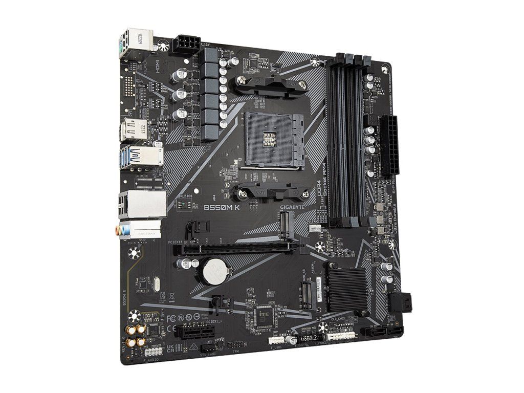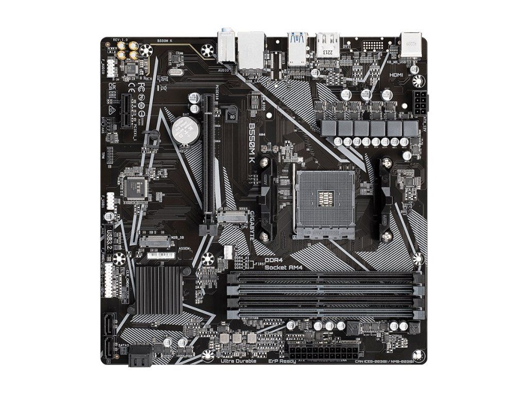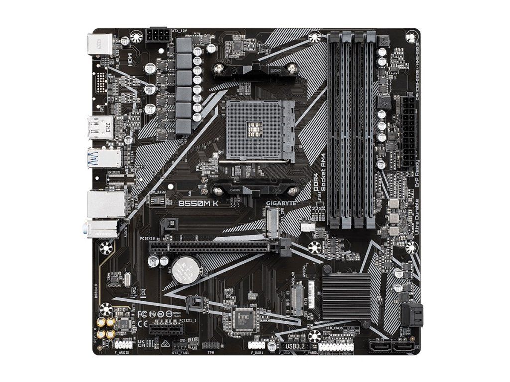 GIGABYTE B550M K (rev. 1.0) Chipset: AMD B550 Rozměrový formát: Micro ATX (244x244mm) Podpora pro procesory: AMD Ryzen™ 5000 Series/Ryzen™ 5000 G-Series/Ryzen™ 4000 G-Series a Ryzen™ 3000 Series Patice procesoru: AM4 Paměť: * 4x DIMM patice podporující až 128GB, DDR4 4733(OC)/4600(OC)/4400(OC)/4266(OC)/4133(OC)/4000(OC)/3866(OC)/3733(OC)/3600(OC)/3466(OC)/3400(OC)/3200/2933/2667/2400/2133MT/s * dvoukanálová architektura paměti * podpora paměťových modulů ECC bez vyrovnávací paměti DIMM 1Rx8/2Rx8 * podpora paměťových modulů DIMM bez vyrovnávací paměti bez ECC 1Rx8/2Rx8/1Rx16 * podpora paměťových modulů Extreme Memory Profile (XMP) Grafické výstupy: integrovaný grafický procesor * 1x DisplayPort s maximálním rozlišením 5120x2880 při 60Hz * 1x HDMI s maximálním rozlišením 4096x2160 při 60Hz * maximální sdílená paměť 16GB Zvuková karta: kodek Realtek 2/4/5.1/7.1 Ethernet: Realtek® GbE LAN Rozšiřující sloty: * 1x PCI Express x16 * 1x PCI Express x1 RAID řadič: podpora pro SATA RAID 0/1/10 Úložný prostor: celkem podporuje 2 sloty M.2 a 4 porty SATA 6Gb/s * 1x M.2 (M2A_CPU), M key, typ 2280 SSD (podpora SATA a PCIe 4.0/3.0 x4/x2) * 1x M.2 (M2B_SB), M key, typ 2280 SSD (podpora SATA a PCIe 3.0 x2) * 4x port SATA 6Gb/s USB: Zadní USB (celkem 8 portů) * 4x USB 3.2 Gen1 * 4x USB 2.0/1.1 Přední USB (celkem 4 porty) * 1x USB 3.2 Gen 1 header - podpora dalších 2 portů USB 3.2 Gen 1 * 1x USB 2.0 header - podpora dalších 2 portů USB 2.0 Porty na zadním panelu: * 1x PS/2 dělený pro klávesnici/myš * 1x DisplayPort * 1x HDMI * 4x USB 3.2 Gen 1 * 4x USB 2.0/1.1 * 1x RJ-45 * 3x audio jack Interní porty: Napájení * 1x 24-pin ATX hlavní napájecí konektor * 1x 8-pin ATX 12V napájecí konektor Související s ventilátorem a chlazením * 1x CPU fan header * 1x system fan headers Související s úložištěm * 2x M.2 slot (Key M) * 4x SATA 6Gb/s port USB * 1x USB 3.2 Gen 1 header * 1x USB 2.0/1.1 header Ostatní * 1× konektor pro tlačítka na předním panelu * 1× konektor pro audio na předním panelu * 1x Trusted Platform Module (TPM) header (2x 6pin, pouze pro modul GC-TPM2.0_S) * 1× propojka Clear CMOS BIOS: 1x 128Mb flash, AMI UEFI BIOS Odkaz na stránku výrobce: https://www.gigabyte.com/Motherboard/B550M-K-rev-10#kfDodatočné parametre