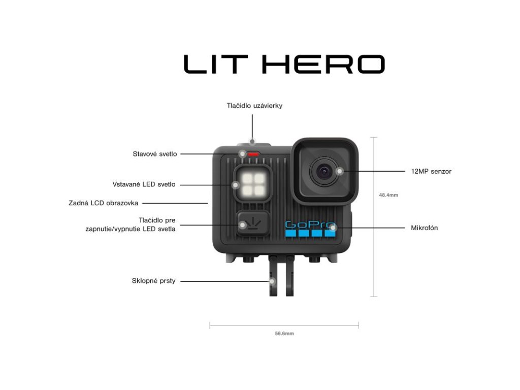 LIT HERO - Akčná kamera s 12 Mpx snímačom a vstavaným LED svetlom (3 úrovne jasu). Záznam videa v rozlíšení 4K pri 60 fps (2x Slo-Mo) a fotografie 12 Mpx. Pomer strán 4:3 s uhlom 165° poskytuje o 25 % vyššie zorné pole. Odolná konštrukcia, vodotesná do 5 m. Vstavaná batéria Enduro pre dlhšiu výdrž a výkon v chlade. Stabilizácia HyperSmooth cez aplikáciu Quik. Magnetické držiaky a vymeniteľný hydrofóbny kryt objektívu. Kompatibilita s 35+ držiakmi. Automatické nahrávanie do cloudu a tvorba videí (vyžaduje predplatné).