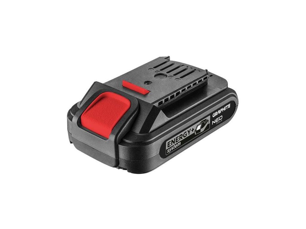 Akumulátor Energy+ 18V, Li-Ion 2,0 Ah s možnosťou nabíjania bez rizika straty kapacity. Vybavený indikátorom nabitia a elektronickým systémom kontroly teploty a prietoku prúdu počas nabíjania a vybíjania. (nabíjačka nie je súčasťou balenia)