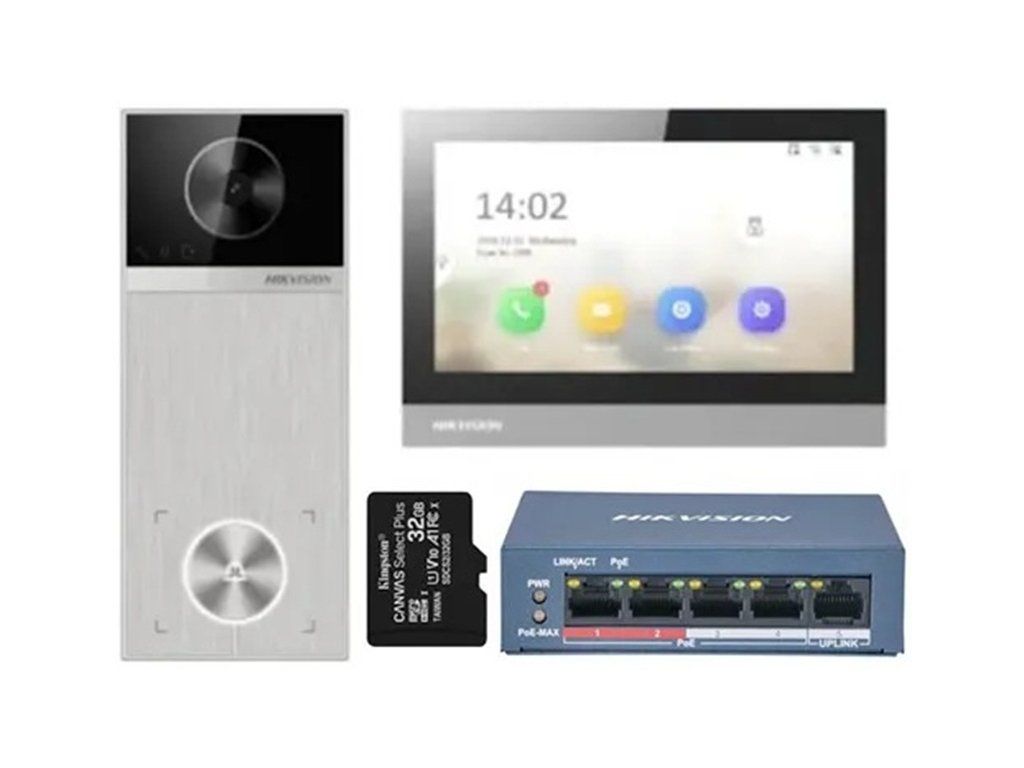 1-tlačid. SET IP VILLA: 1x DS-KH8380-WTE1, DS-KV6114-MWBE1 a DS-KABV6114-RS, PSU, switch, 32GB karta