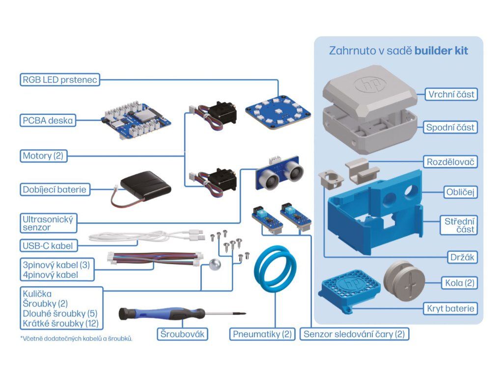 HP Robots | Otto Starter Creator Kit Otto, první člen rodiny HP Robots, je modulárním robotem s jednoduchým programováním, který provede žáky návrhem, 3D tiskem, stavbou a základními koncepty robotiky. Rozvíjí důležité dovednosti 21. století jako je řešení problémů a kritické myšlení. Otto Creator Kit obsahuje všechny elektronické součástky, které potřebujete k sestavení robota OTTO. Ideální stavebnice pro majitele 3D tiskárny, kteří si mohou samostatně vytisknout tělo a kola. Otto: Modulární robot pro zábavu i vzdělávání Otto je prvním členem z rodiny HP Robots a je navržen tak, aby zábavnou a poutavou formou seznamoval žáky s principy robotiky, programování a 3D tisku. Jedná se o modulární platformu, kterou si studenti sami postaví a následně ji můžou rozšiřovat a upravovat dle své fantazie. Otto tak rozvíjí důležité dovednosti 21. století, jako je řešení problémů, kritické myšlení a kreativita. Pro koho je Otto určen? Otto je ideální pro děti od 8 let. Může se s ním pracovat jak ve škole pod dohledem učitele, tak i doma. Pro studenty starší 14 let není dohled dospělé osoby nutný. Díky přehlednému a srozumitelnému obrázkovému manuálu zvládne sestavení Otta bez problémů každý. Možnosti rozšíření a úprav Otto nabízí mnoho možností pro rozšíření a úpravy, takže se s ním studenti nikdy nenudí. Můžou k němu přidávat doplňky, navrhovat vlastní vzhled nebo si robota upravovat pomocí 3D designu a rozšiřujících prvků. Creator nebo Builder sada? Otto je k dispozici ve dvou verzích - jako Builder nebo Creator sada. Builder sada obsahuje vše potřebné k sestavení robota. Creator sada oproti tomu obsahuje pouze elektronické součásti, šasi je pak potřeba vytisknout na 3D tiskárně. Snadné programování pro všechny úrovně Otto nabízí hned 3 možnosti programování, takže si s ním poradí i úplní začátečníci i zkušení programátoři: *Ovládání v rozhraní web control: Jednoduché a intuitivní rozhraní umožňuje ovládat Otta pomocí modulární a přizpůsobitelné nabídky widgetů. *Blokové programování: Programování pomocí bloků je ideální pro začátečníky, jelikož systém drag-and-drop umožňuje intuitivní pochopení a skládání příkazů. *Textové programování v Pythonu nebo C++: Zkušenější uživatelé můžou napsat vlastní kód v programovacích jazycích Python nebo C++ a využít ho i v jiných populárních platformách, jako je Thonny IDE a Arduino IDE. Rozměry produktu (š x h x v): 9 × 8 × 9 cm Co je obsaženo v krabici: *2× pneumatika *základní deska *dobíjecí baterie *2× servomotor se sadou šroubů *senzor pro sledování čáry *RGB LED diody *ultrazvukový senzor *3pin a 4pin kabely *křížový šroubovák *USB-C kabel *arch samolepek *návod k použitíDodatočné parametre