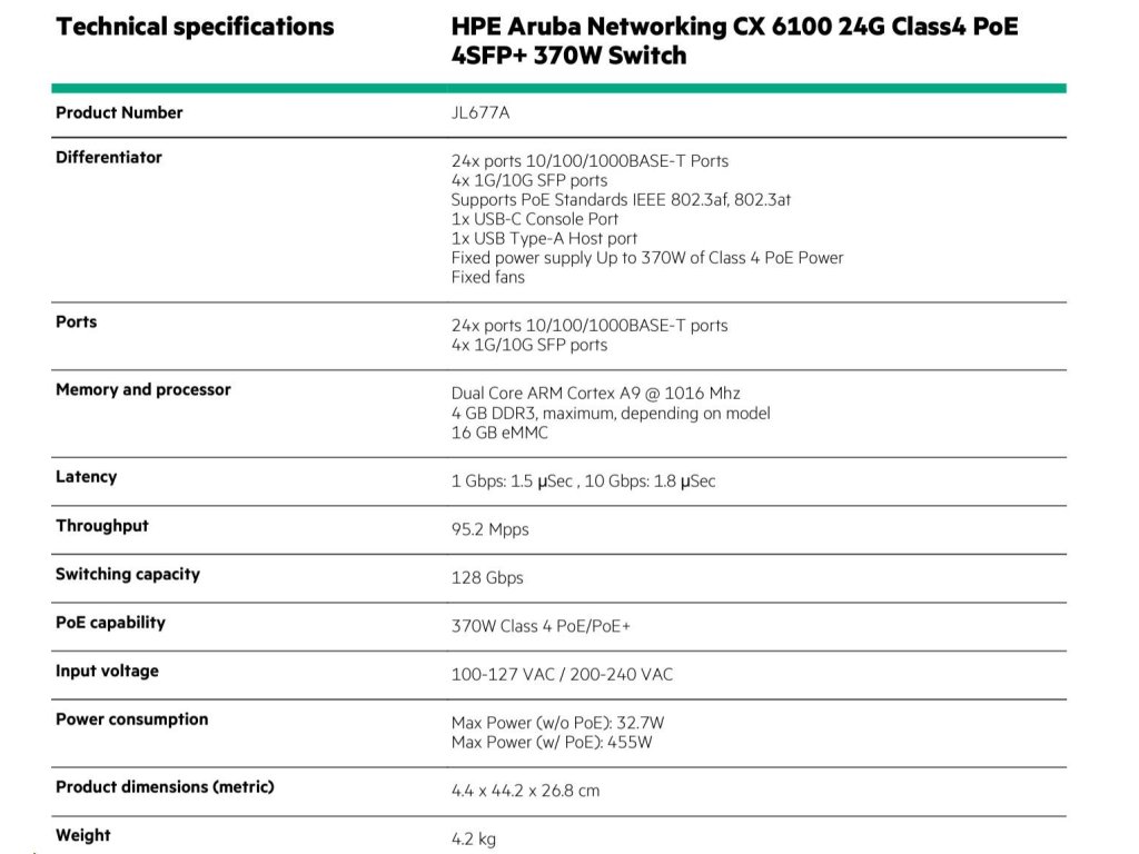 HPE Aruba Networking CX 6100 24G Class4 PoE 4SFP+ 370W Switch JL677A#ABB