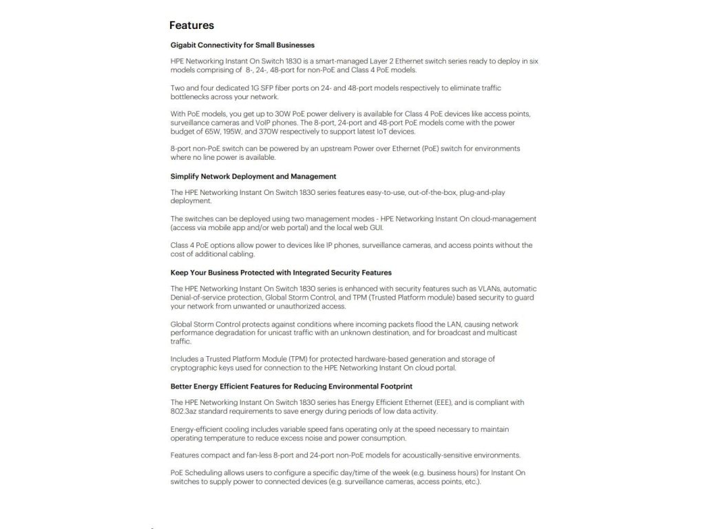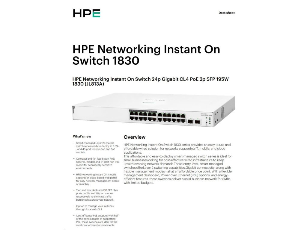 HPE Networking Instant On Switch 24p Gigabit CL4 PoE 2p SFP 195W 1830 (JL813A) JL813A#ABB