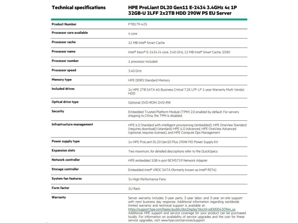 HPE PL DL20g11 6325P (3.5G/4C8T) 1x32G 2x2TB/7.2k SATA VROC 2LFF-HP 4p1Gb 290W Smart Choice P87462-425